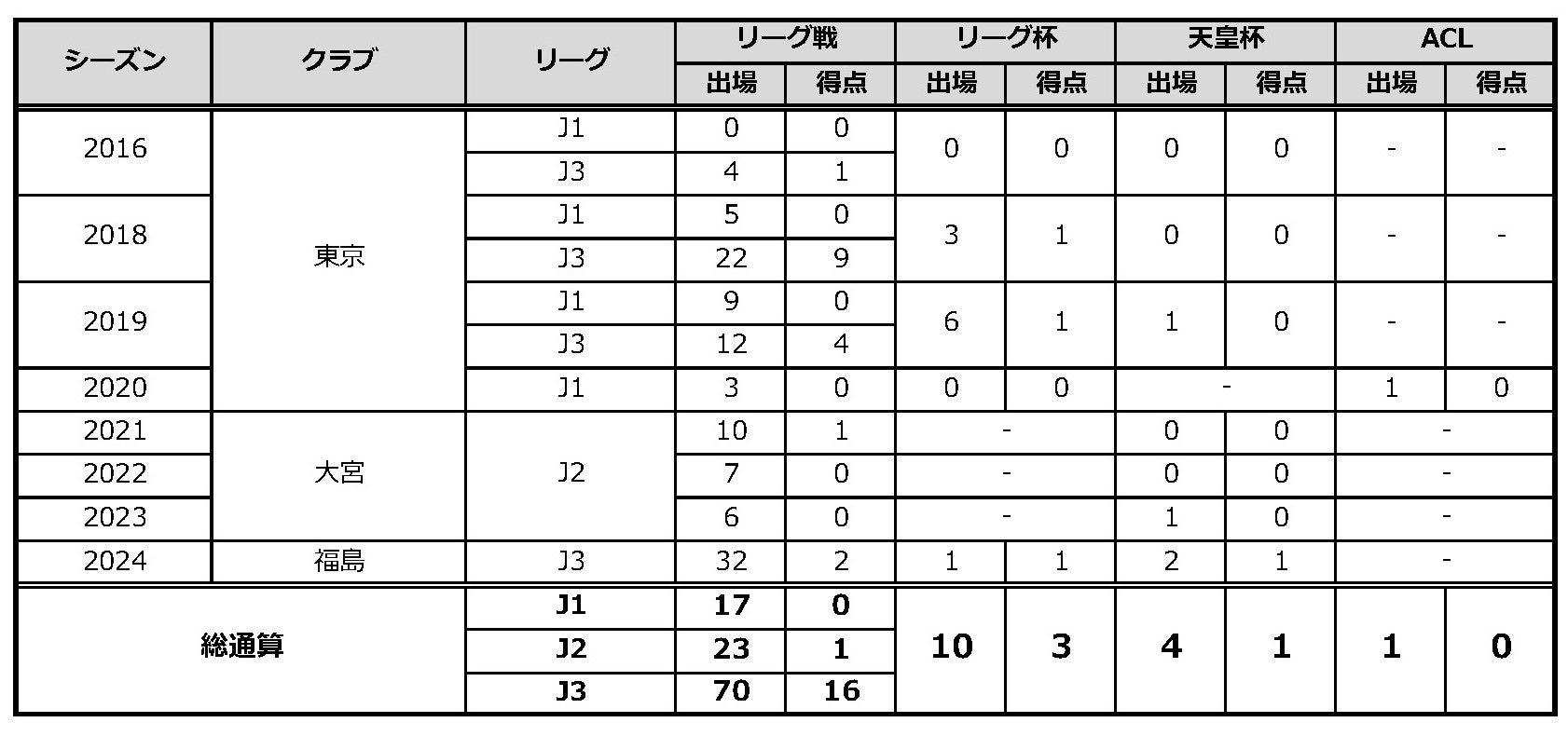サッカー歴:八王子CBX FC→FC東京U-15むさし→FC東京U-18→中央大→FC東京→大宮アルディージャ→福島ユナイテッドFC
