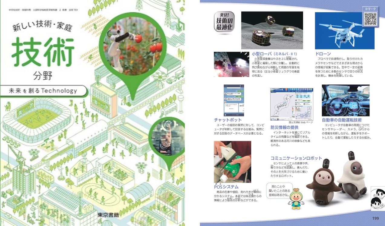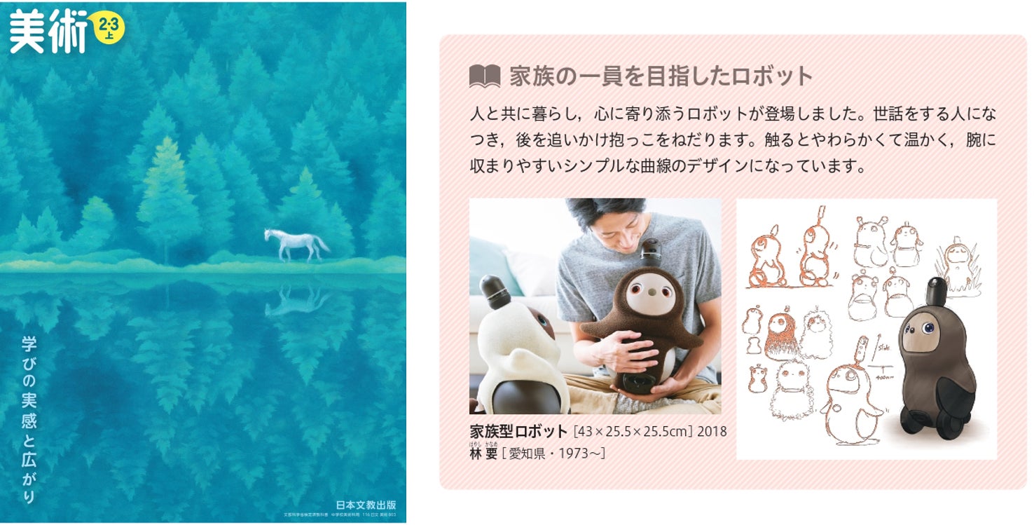 教科書「新しい技術・家庭(技術分野)」(発行:東京書籍)では、情報の技術の一例として紹介。教科書「中学美術」(発行:日本文教出版)では『LOVOT』のデザインを中心とした内容が掲載されています。また副教材として使用する資料集「社会科資料集」(発行:日本標準)、「社会科資料集」(発行:新学社)「新技術家庭総合資料」(発行:正進社)では、最先端の技術として『LOVOT』が紹介されています。さらに「VISTA Logic and Expression Ⅱ」(発行:三省堂)ではディベートの”Robot pets are better than real pets.”という題材のイメージとして『LOVOT』を掲載。「Power On Ⅱ English Communication」(発行:東京書籍)の指導書付属資料として『LOVOT』が掲載されています。