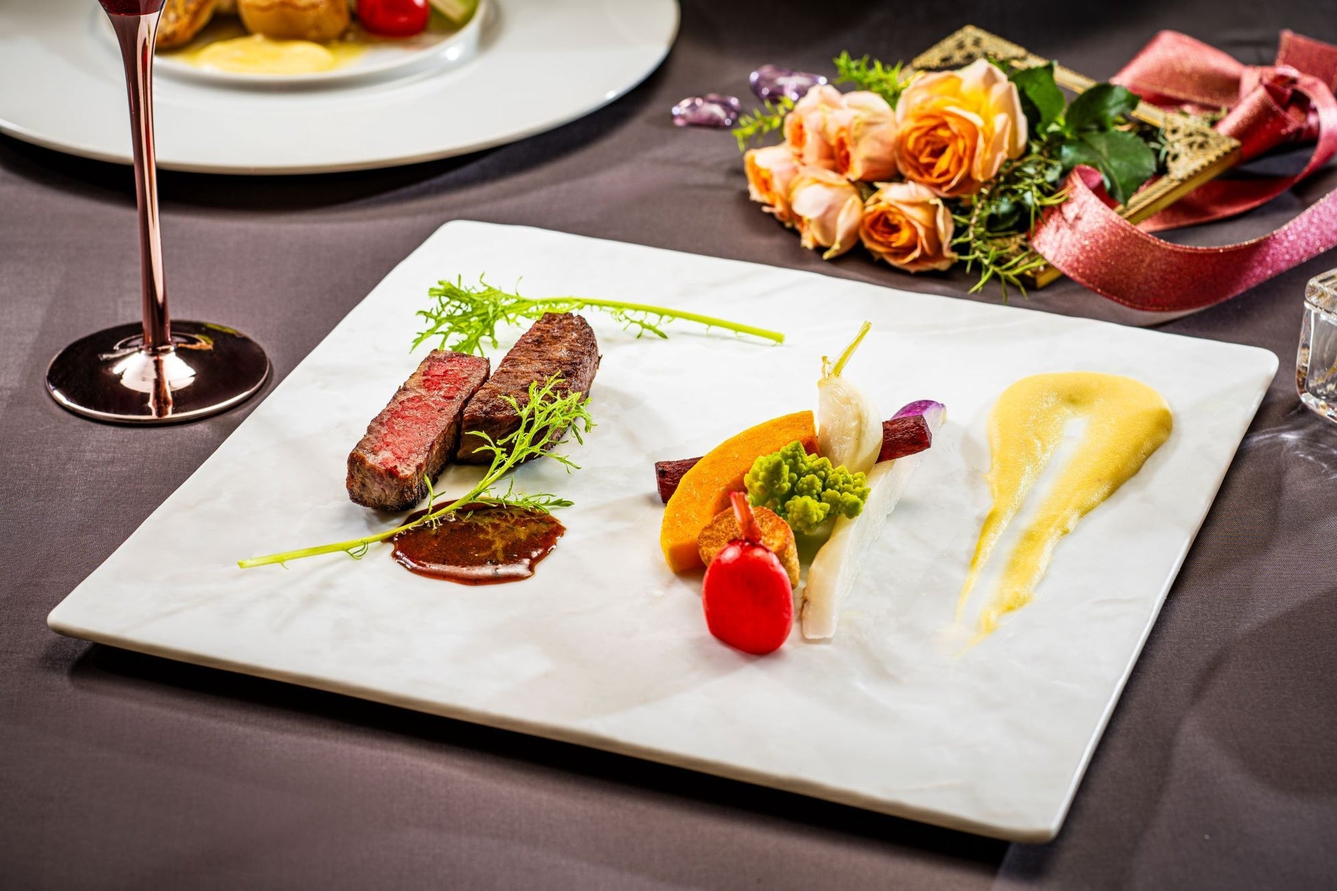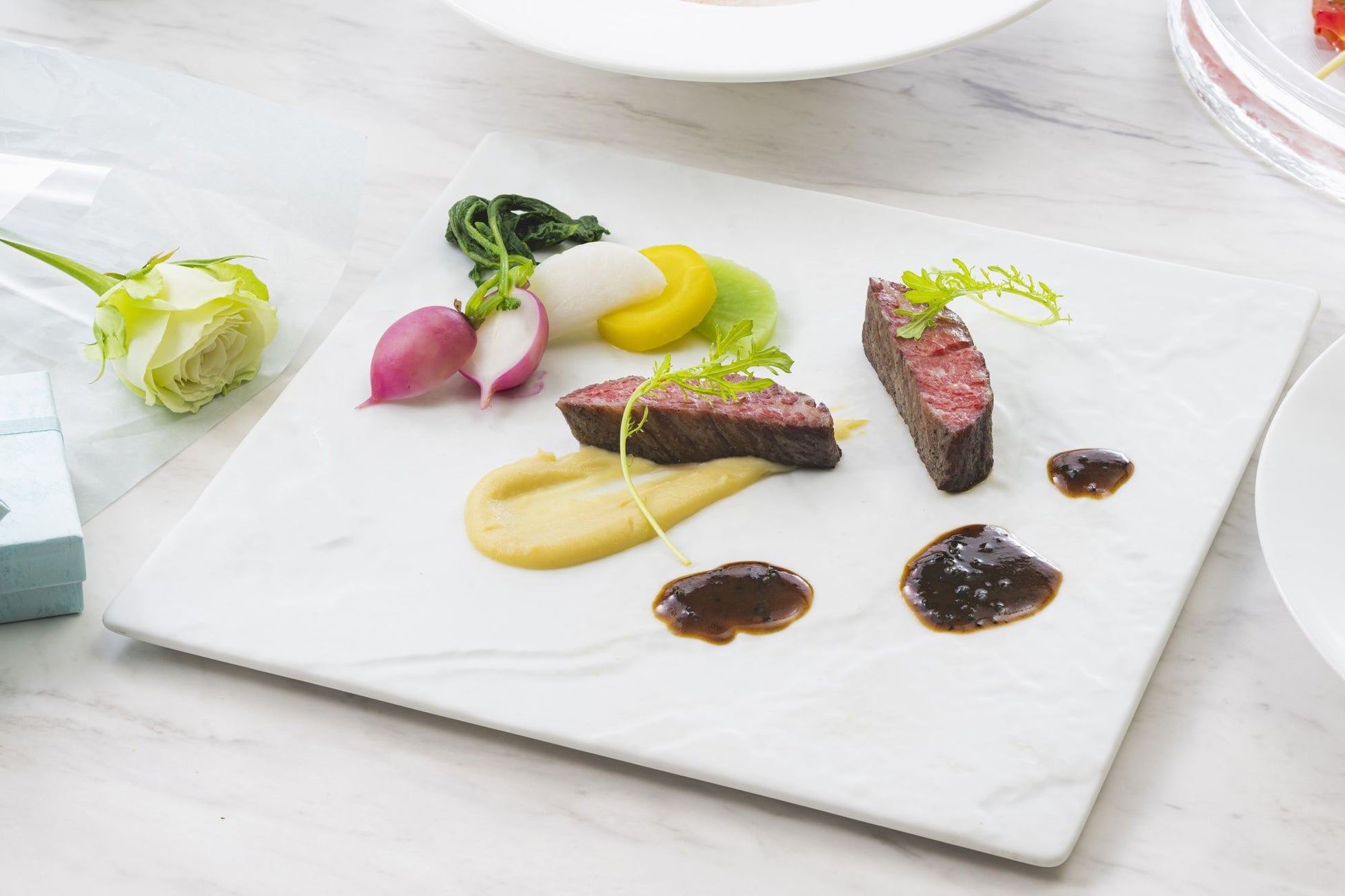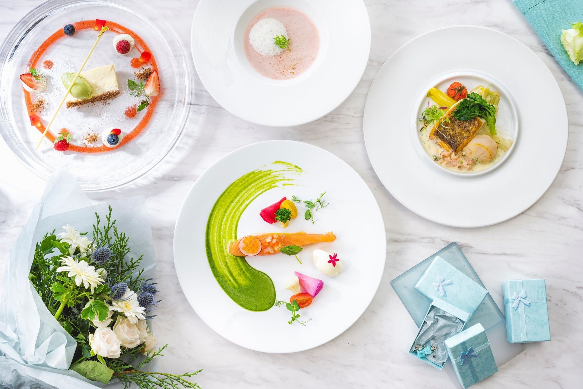 フレンチレストラン「ベイ・ビュー」のバレンタインとホワイトデーのコースは、鮮やかなイチゴのスパークリングカクテルでの乾杯からスタート。彩り豊かなオードブルや、クリーミーなスープの後に続くメインディッシュはシェフ自慢の品々。お魚料理には、ふんわりとした食感の真鯛と、新鮮な帆立貝を楽しめる「真鯛と帆立貝のポワレ」をご用意。お肉料理には、国産牛の旨味とトリュフソースが絶妙に絡む「国産牛サーロインのポワレ」を贅沢にご提供します。バレンタインコースのデザート「バレンタイン特製フォンダンショコラ」には「Happy Valentine’s Day」のメッセージを添えて、炎の演出で仕上げます。希少なベネズエラ産カカオ“チュアオ”を使用したホテルオリジナルボンボンショコラ「ベサメムーチョ」がプレゼントに付いた贅沢なコース。ホワイトデーコースのデザートは、リッチな味わいのテリーヌと香ばしいピスタチオを楽しめる「ホワイトチョコレートのテリーヌとピスタチオのアイスクリーム」に感謝の気持ちを込めて「Thank you always」のメッセージを入れてご提供。一輪の白いバラをプレゼントします。シェフ髙木のこだわりが詰まった繊細なお料理とスペシャルデザートで、大切な人との思い出に残るひとときをお過ごしください。