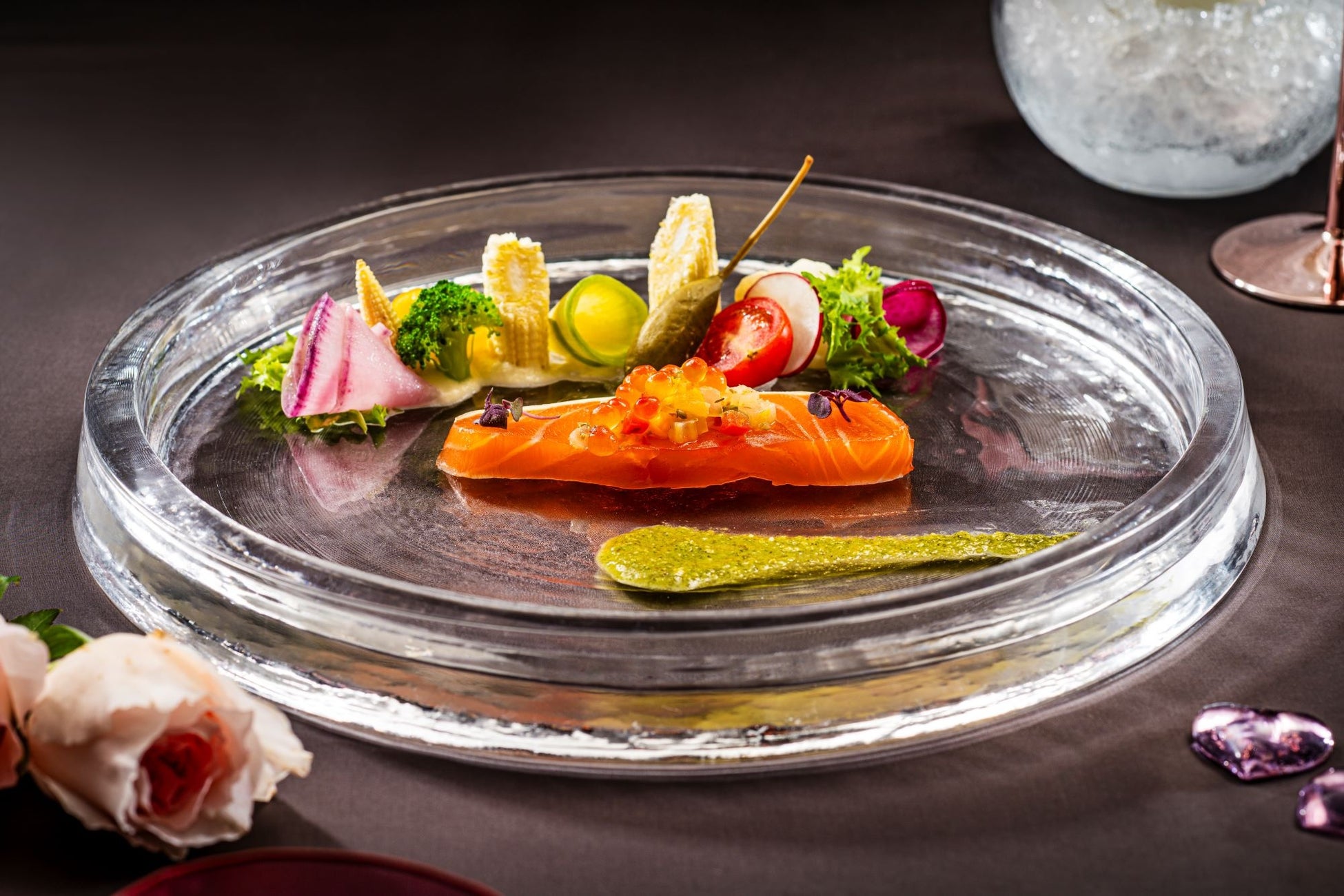 <オードブル>ノルウェー産サーモンのマリネ ワサビ風味のバジルソース