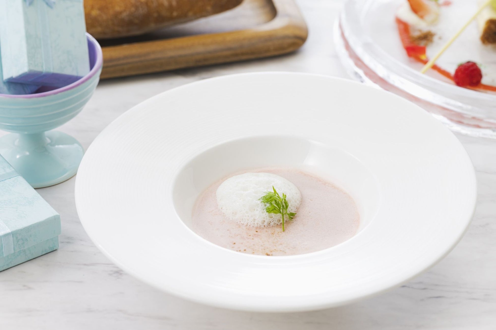 <スープ>ビーツとじゃがいも 薄紅色のクリームスープ カプチーノ仕立て