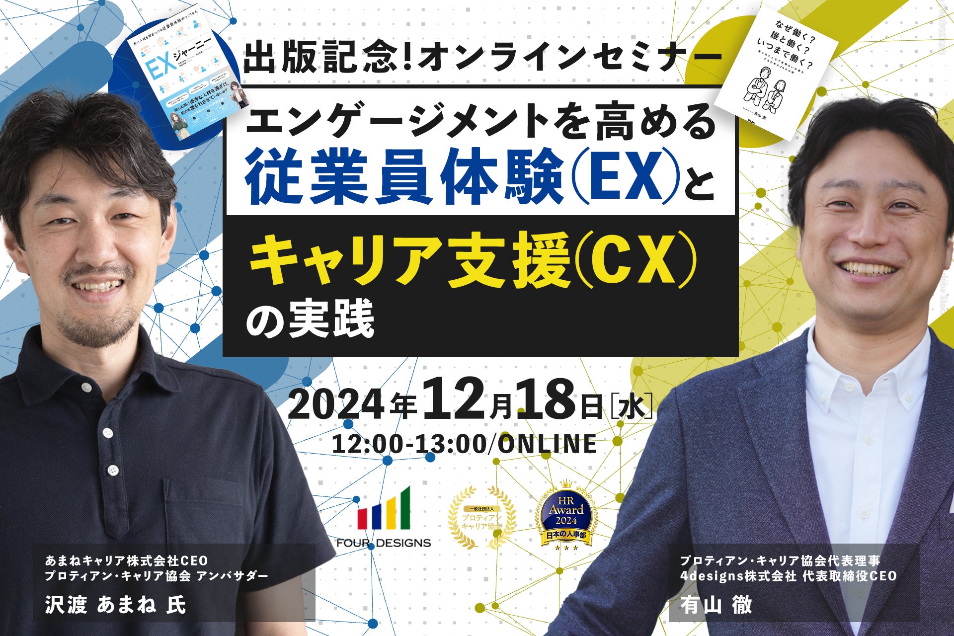 一般社団法人プロティアン・キャリア協会(東京都新宿区、代表理事:田中研之輔・有山徹、以下「当協会」)は、組織と個人のより良い関係構築と個人の主体的なキャリア開発を支援する団体です。このたび、あまねキャリア株式会社CEO/プロティアン・キャリア協会 アンバサダー 沢渡 あまね氏をお招きし、12月18日(水)12:00~オンラインにて「エンゲージメントを高める従業員体験(EX)とキャリア支援(CX)の実践」を開催します。本イベントは沢渡氏の新著「EXジャーニー~良い人材を惹きつける従業員体験のつくりかた~」、有山の新著「なぜ働く?誰と働く?いつまで働く?限られた人生で後悔ない仕事をするための20の心得」の出版記念イベントとなります。プロティアン・キャリア協会代表理事 有山徹の対談を通じて、従業員体験(EX)とキャリア支援(CX)を融合させることで、どのようにエンゲージメント向上、人材定着率向上、組織活性化を実現するか解説します。