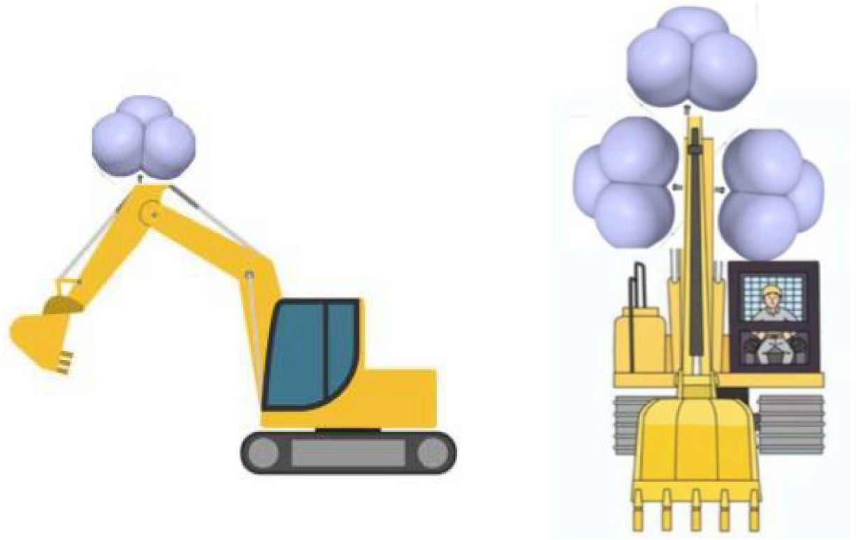 ①電線・架線 超音波検知センサー ②バックホー旋回時電線超音波検知センサー(左右)