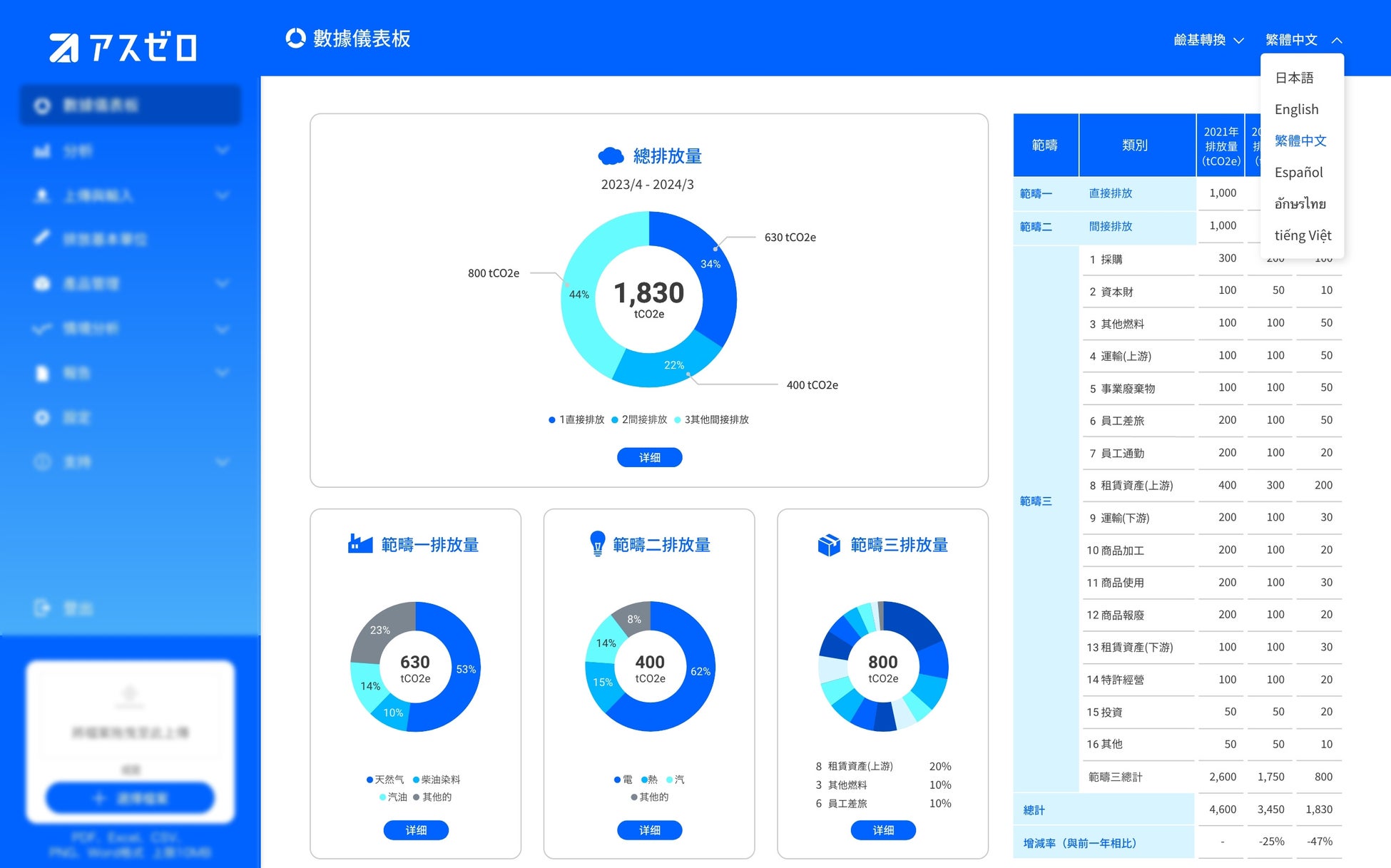 さらに、当社の海外現地法人であるAsuzero Singaporeにおいても、APACに拠点を置く企業からのCO2可視化のニーズが高まっています。アジアに拠点を持つグループ企業、サプライチェーン、および非日本語ユーザーによる算定作業をより推進するため、すでに提供開始をしていた「アスゼロ」英語版、中国語版に加えてタイ語、ベトナム語、スペイン語でも利用可能となりました。
