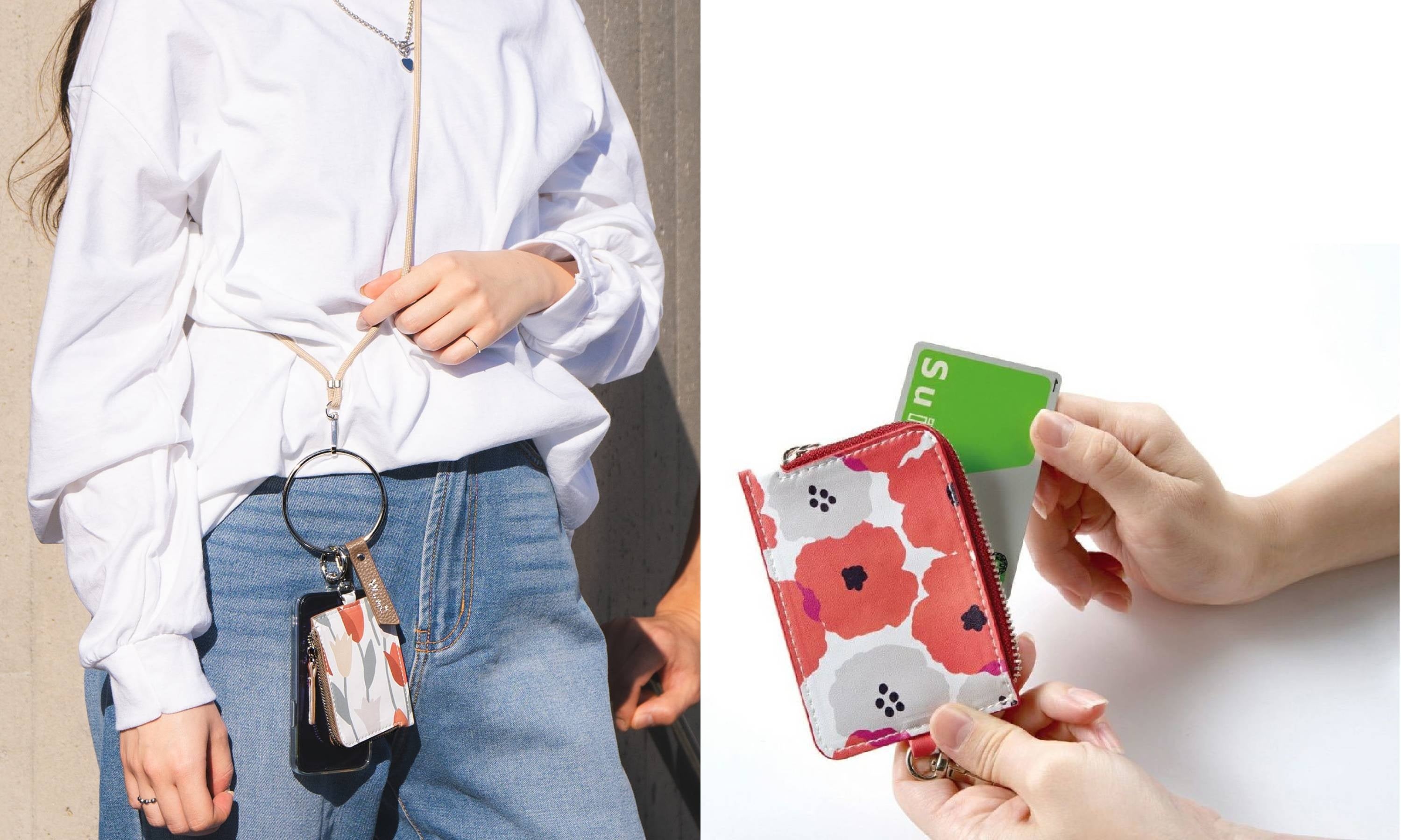 ストラップの紐は長さ調節と取り外しが可能で、取り外せばリングストラップとして腕にかけられる仕様。また付属のポーチも取り外し可能で、ICカードや小銭などのマストアイテムを収納できます。