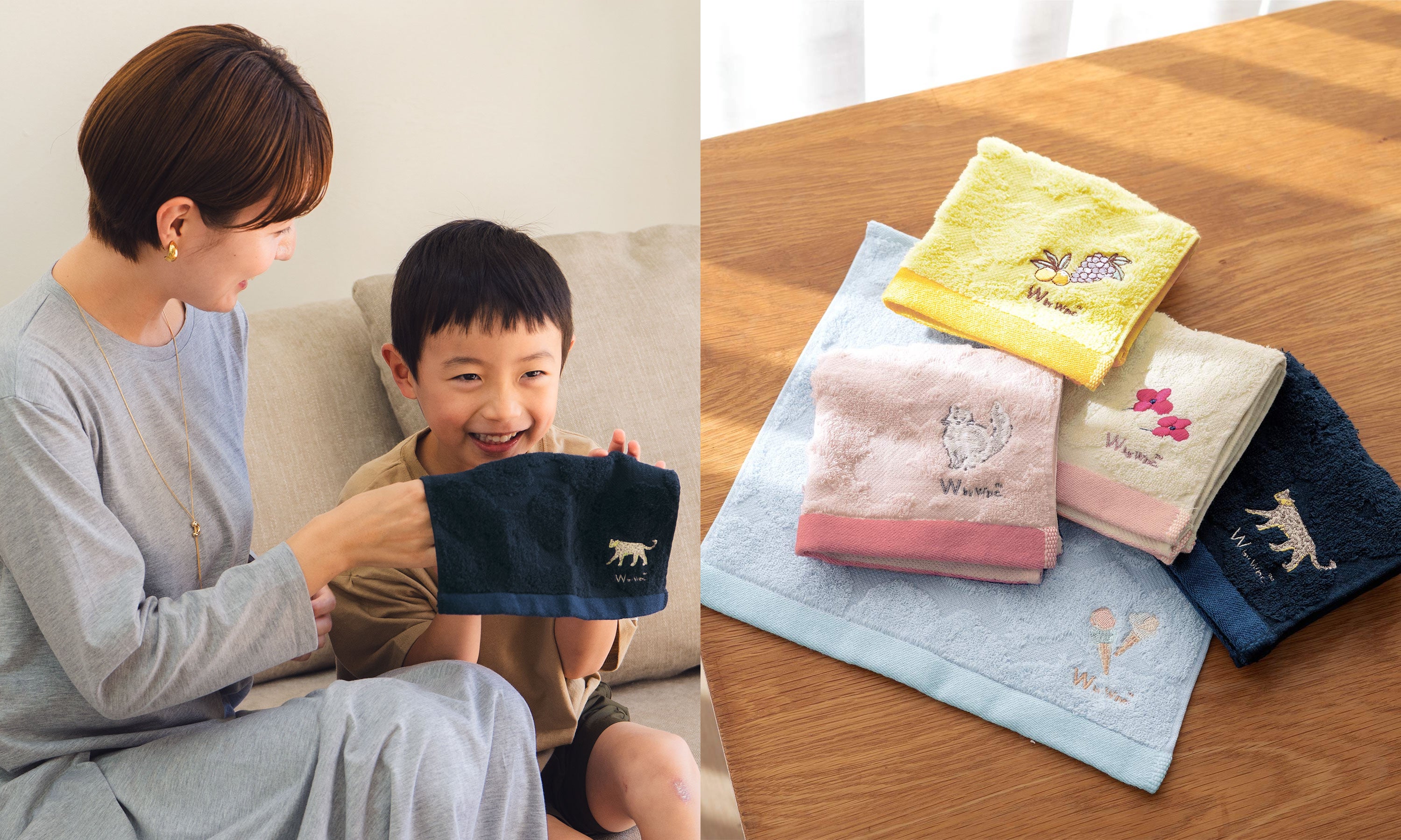 アイスクリームやフルーツ、猫など全5種の刺繍があしらわれたシンプルなハンカチ。世代を問わず好まれる上品な柄で、思わず柄違いで集めたくなるほど。ママへのちょこっとギフトにはもちろん、ご家族で一緒に使用するのにもぴったりなアイテムです。