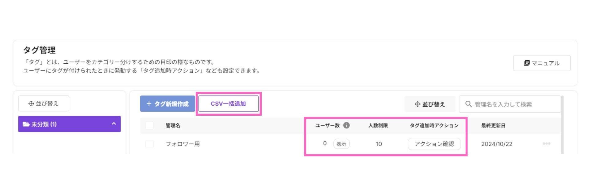 「〇〇に興味あり」「アンケート回答済み」「商品購入者」などお客様の属性や状態に応じたタグを設定することで、ユーザーごとの特徴を簡単に把握できます。