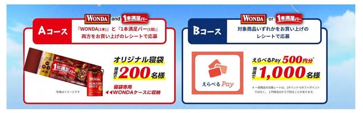 商品・当選者数/【Aコース】オリジナル寝袋 抽選で200名様 ※「ワンダ(1本)」と「1本満足バー(1個)」両方をお買い上げのレシートで応募 【Bコース】えらべるPay 500円分 抽選で1,000名様 ※対象商品いずれかをお買い上げのレシートで応募 ※一部商品の交換レートは、1ポイント=1ギフトポイントではなく、 1円相当分から下回ることがあります