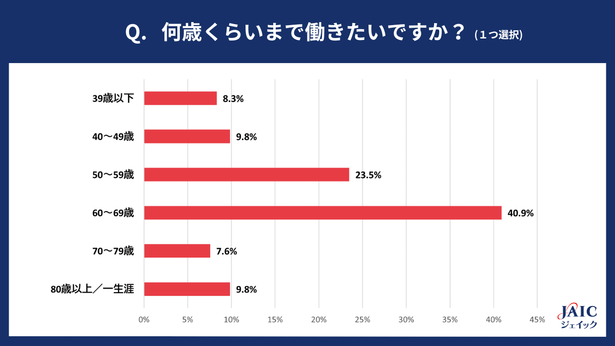 ■「何歳まで働きたいか?」:1位「60〜69歳」(40.9%)、2位「50〜59歳」(23.5%)
