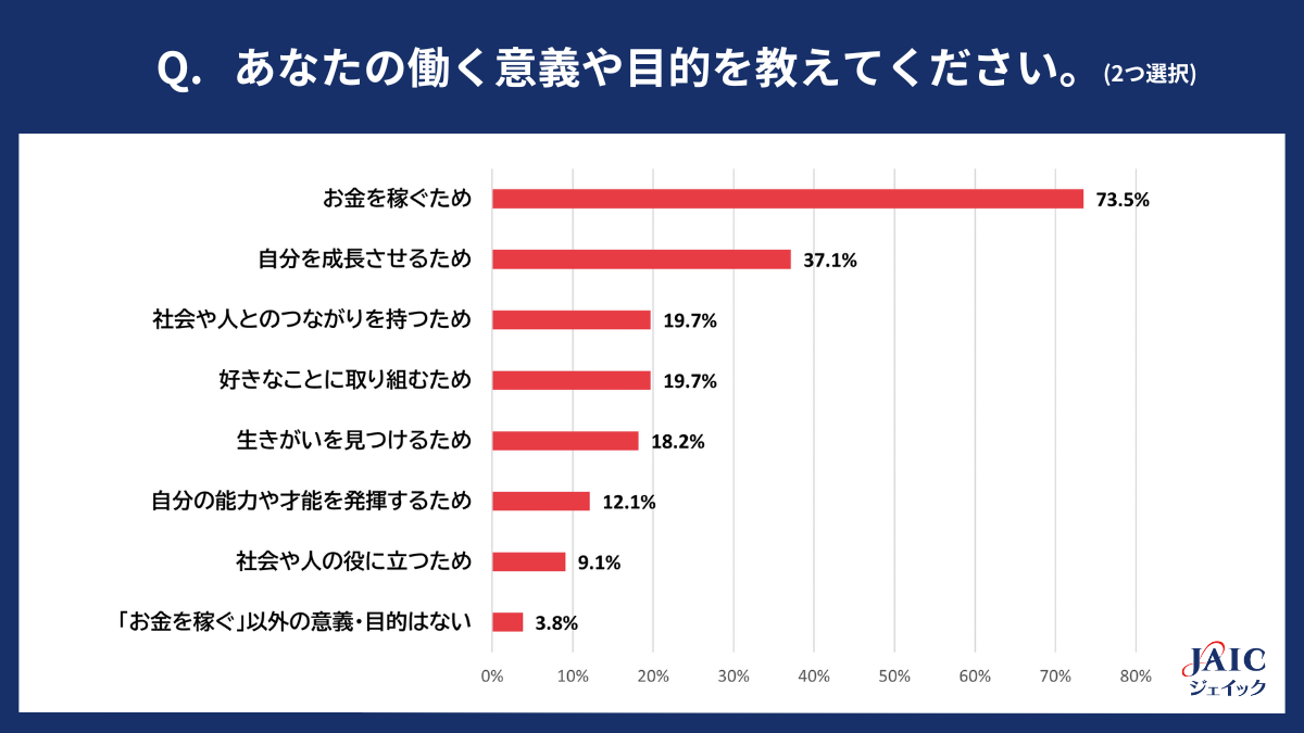 「働く意義や目的として、近いものを2つ選択してください」と質問したところ、1位「お金を稼ぐため」が73.5%、2位「自分を成長させるため」が37.1%、3位「社会や人とのつながりをもつため」「好きなことに取り組むため」が同率で、19.7%となりました。