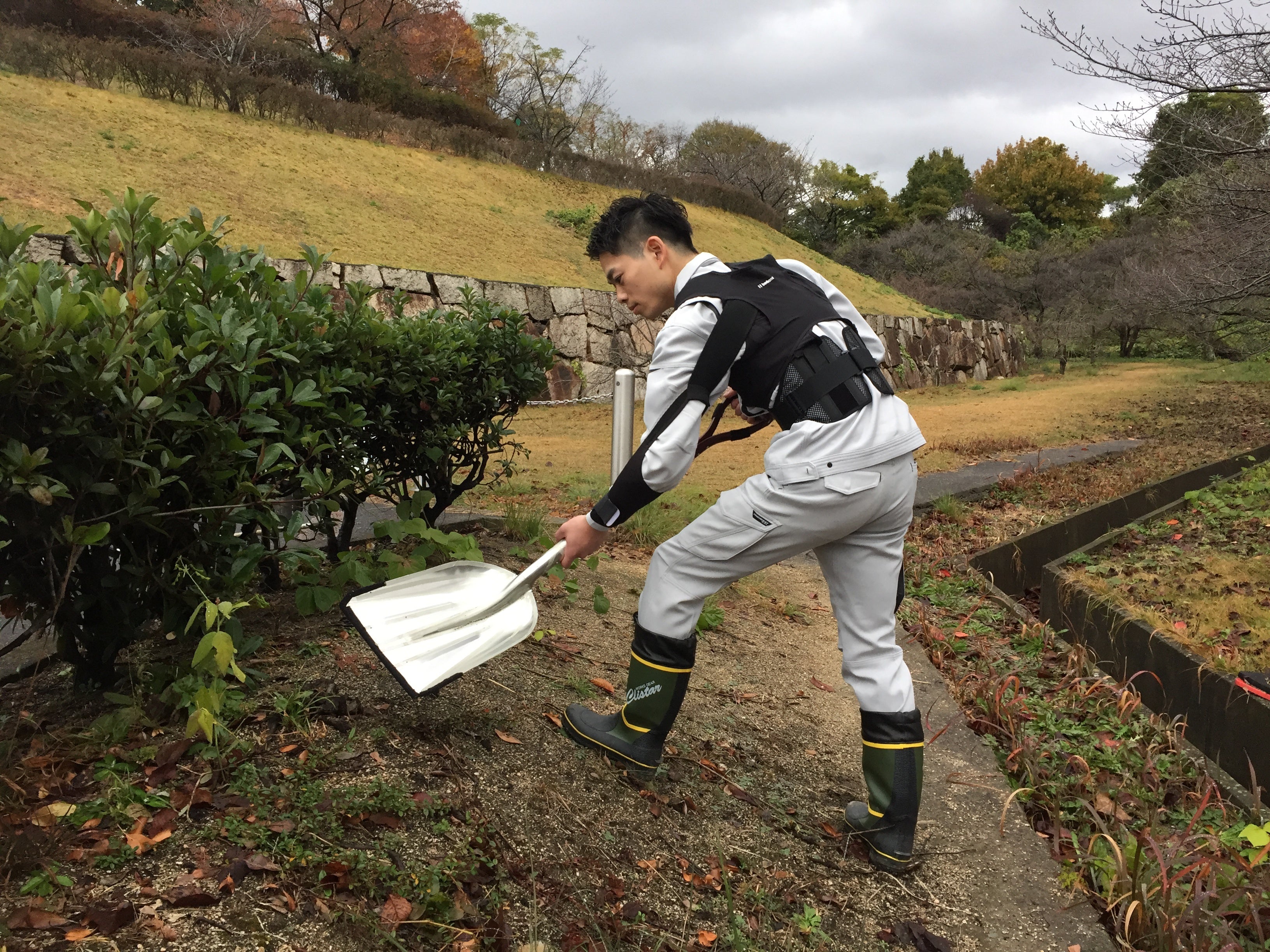 人力掘削作業の負担軽減を図る為、清水建設株式会社と共同開発しました。腰コルセット+腕サポートパーツが付随した、身体に密着するベスト型のアシストスーツです。掘削作業時の腕を引き上げ、腰の安定により作業時の負荷を軽減します。
