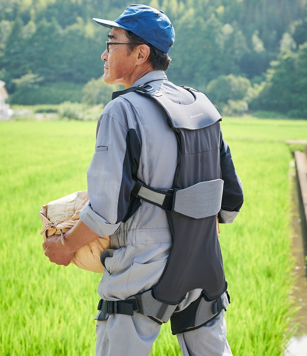 腰への不安が多い農業や工場、建築、介護従事者の負担を軽減する目的で開発されたアシストスーツです。骨盤のコルセット機能と背中のアシスト機能で、作業現場の中腰姿勢、前屈姿勢をサポートします。