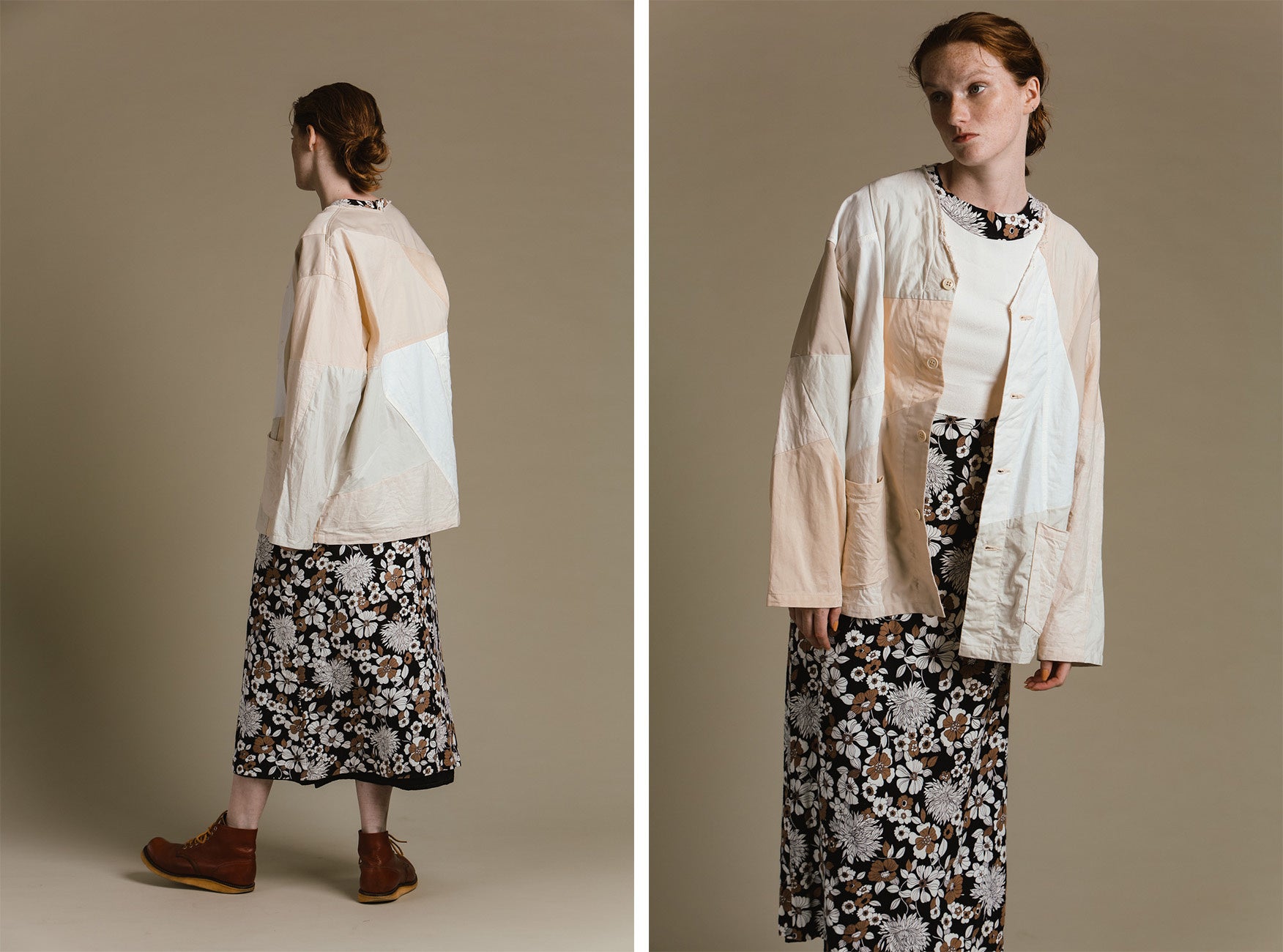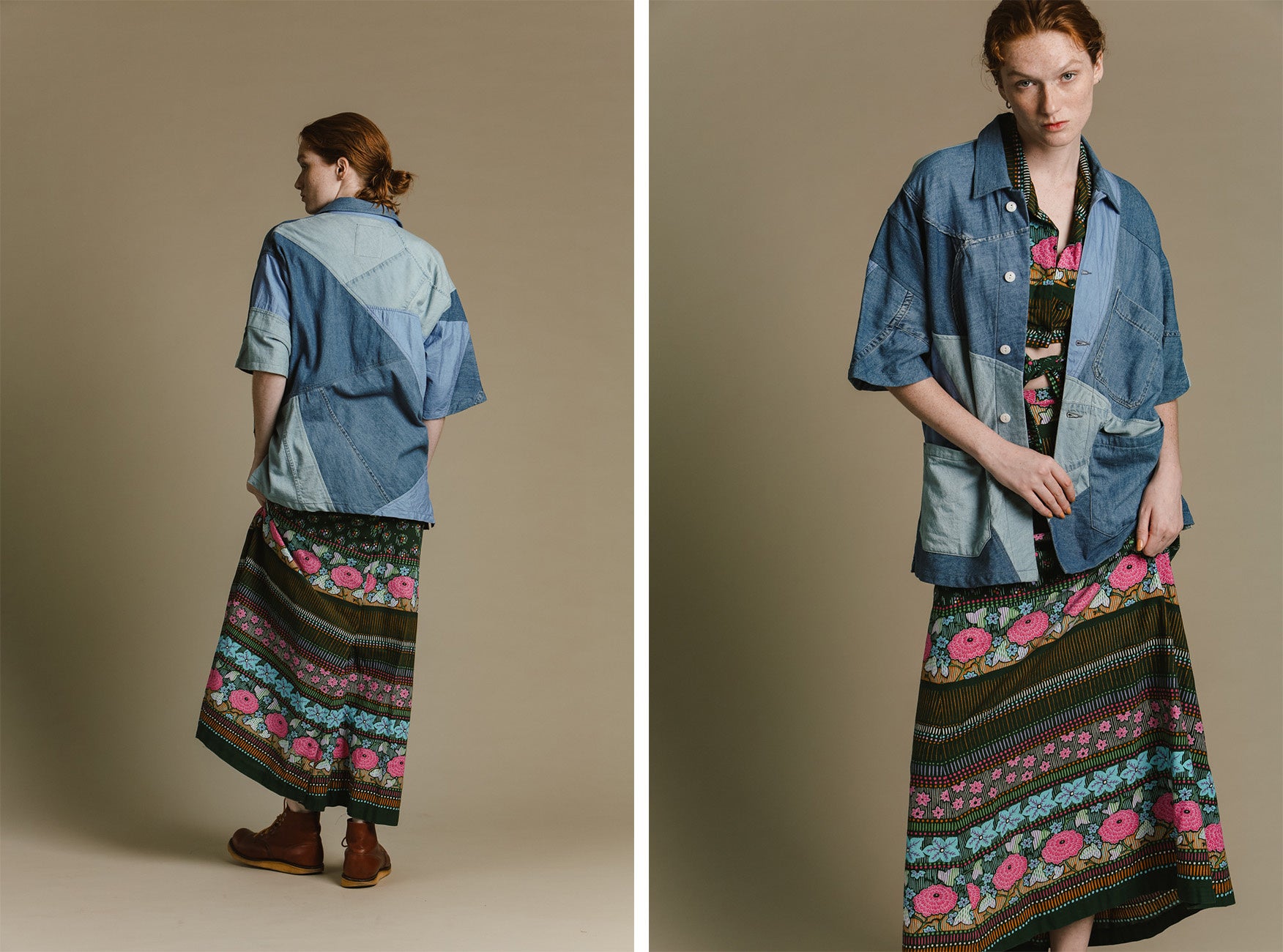 サスティナビリティーの観点から、自分たちの生み出したものを再び消費してもらえるものに生まれ変わらせるために、製品や古着及び使用残生地を使い再び自分たちの手でリメイク製作を行っています。