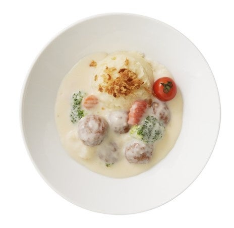 やさしい味わいのクリームシチューに、人気のミートボールと彩り豊かな野菜を加え、数種のソースや生クリームを使ったコクと旨味を召し上がれ。マッシュポテトとの相性抜群です。