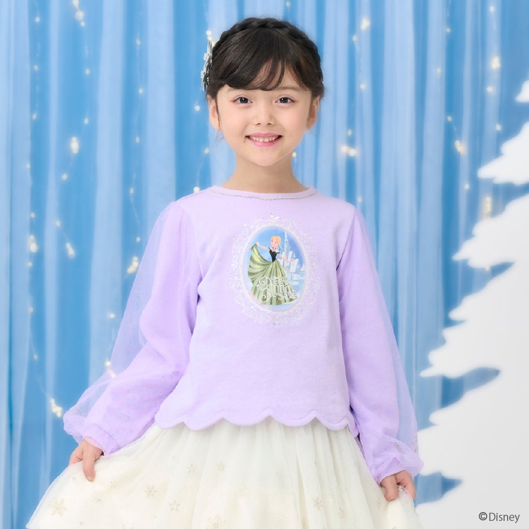 『アナと雪の女王』のデザインをあしらったトレーナーは、ライトブルーは「エルサ」、ラベンダーは「アナ」をデザインした二色展開!繊細な刺しゅうの周りにラインストーンを加えて、上品な雰囲気を演出しました。袖部分はチュールを重ねることで、プリンセスらしさをアップ♡