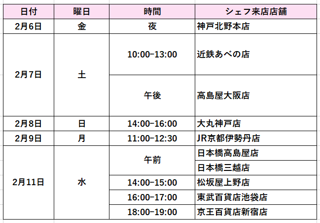 <カファレル パスティッチェーレ来店スケジュール>