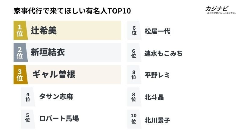 「家事代行で来てほしい有名人」ランキング1位は、辻希美さんでした!4人のお子さんがいるなか、テキパキと仕事や家事をこなす姿に票が集まりました。