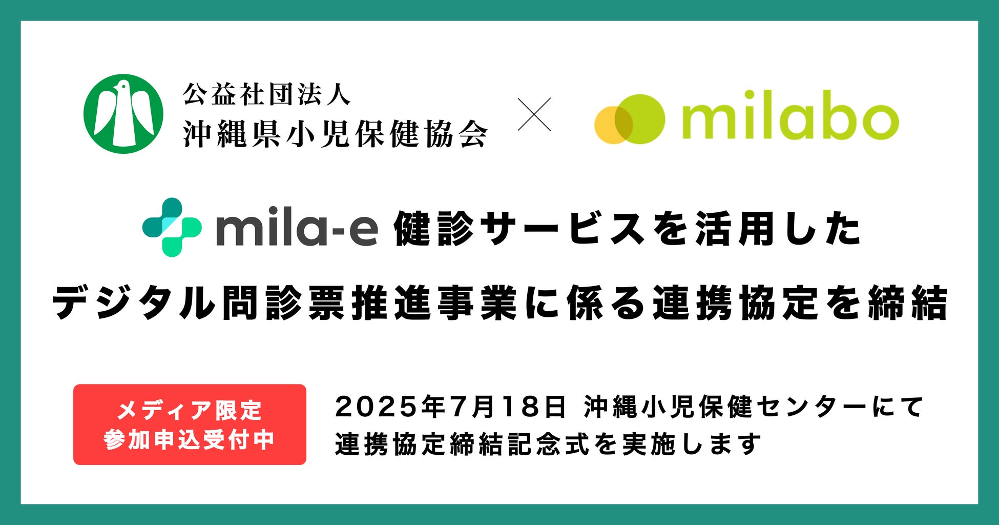 自治体向けサービスを開発する株式会社ミラボ(本社:東京都千代田区、代表取締役:谷川一也、以下「ミラボ」)は、公益社団法人 沖縄県小児保健協会(所在地:沖縄県島尻郡南風原町、会長:宮城 雅也、以下「沖縄県小児保健協会」)と「mila-e 健診サービスを活用したデジタル問診票推進事業に係る連携協定」(以下「本協定」)を2025年5月20日に締結しました。