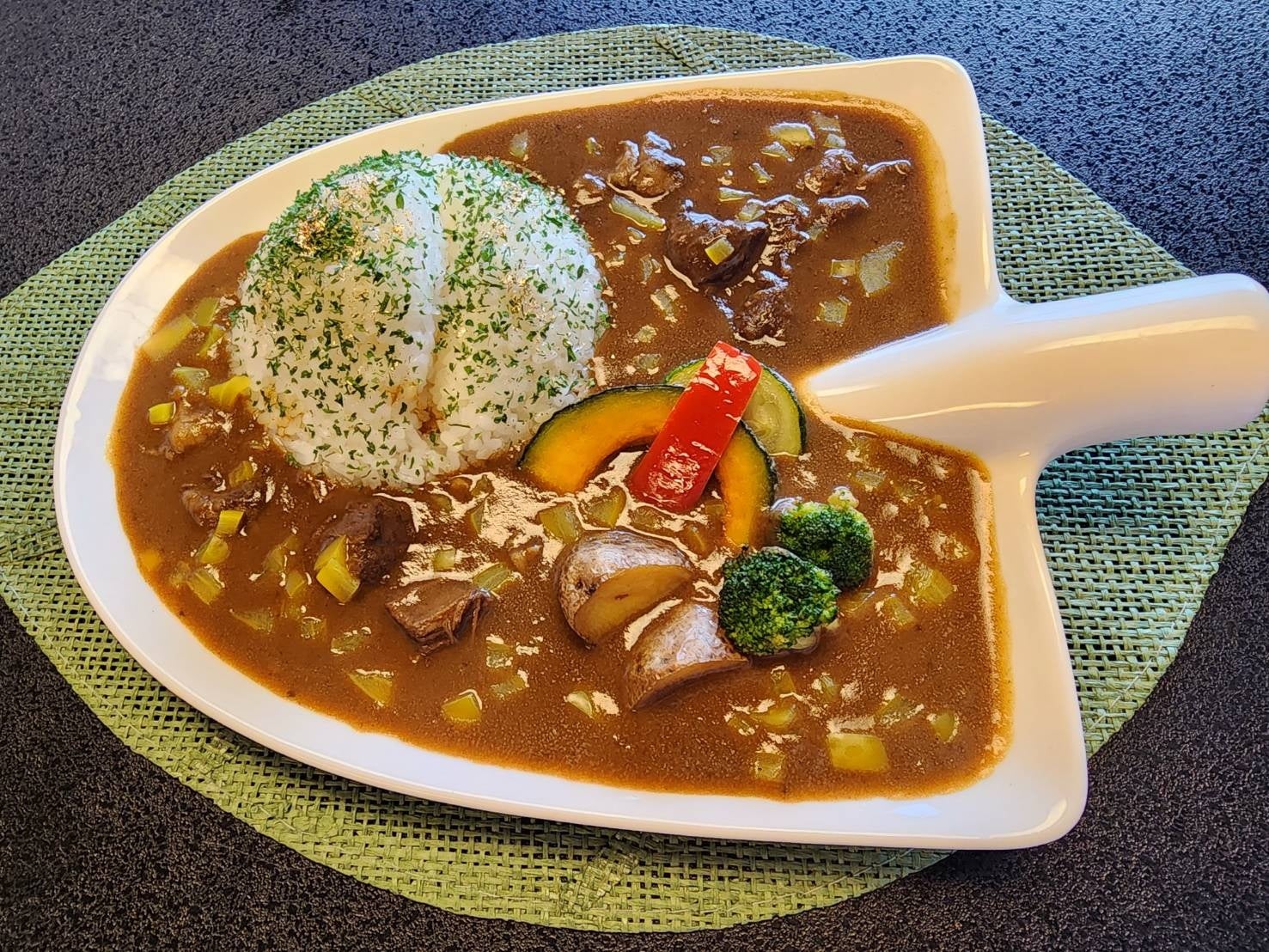 佐渡金山の名物の「道遊の割戸」の形をイメージしたご飯をスコップの形をした皿に盛り付け、食せる“佐渡金山”として、お楽しみいただけるメニューに仕上げました。