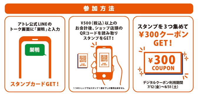 それぞれの館で、500円(税込)以上のお買物で1ショップ毎にデジタルスタンプを1つ獲得。デジタルスタンプを3つ集めたら300円クーポンをプレゼントします。