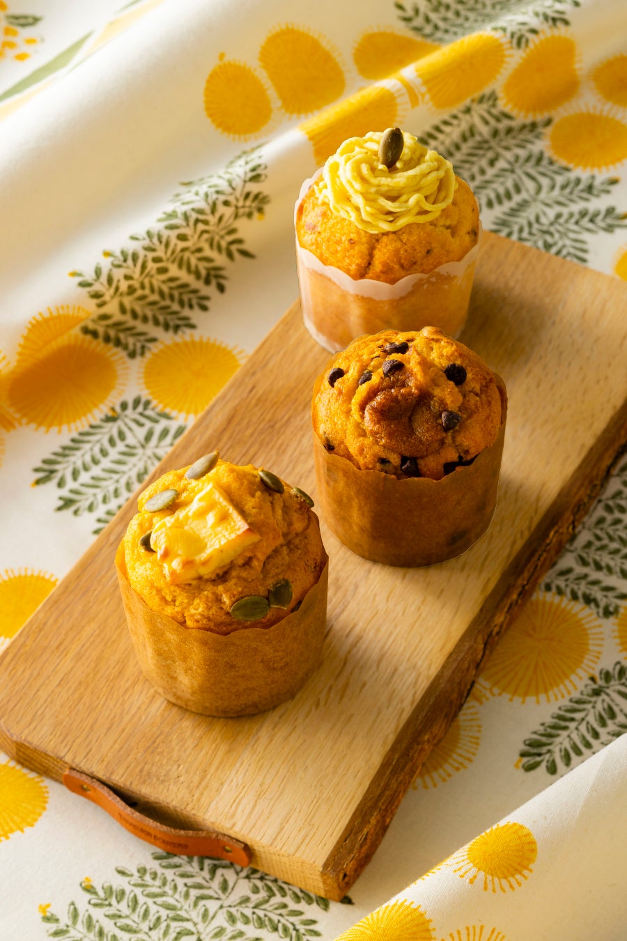 熊本県産渋皮栗(和栗)のシロップ漬けを混ぜ込んだ生地に、熊本県県産シルクスイート(さつまいも)で作ったモンブランクリームを絞って飾り、仕上げに栗と相性の良いラム酒の香りをまとわせました。秋の味覚のさつまいもと栗を同時に楽しめるご当地マフィンです。