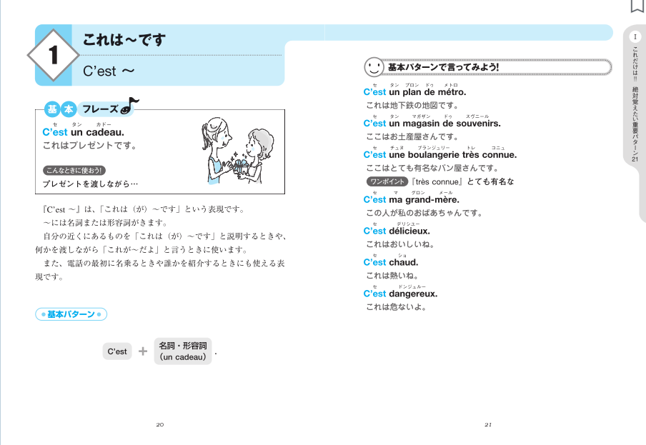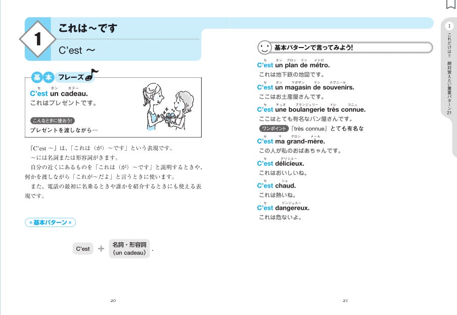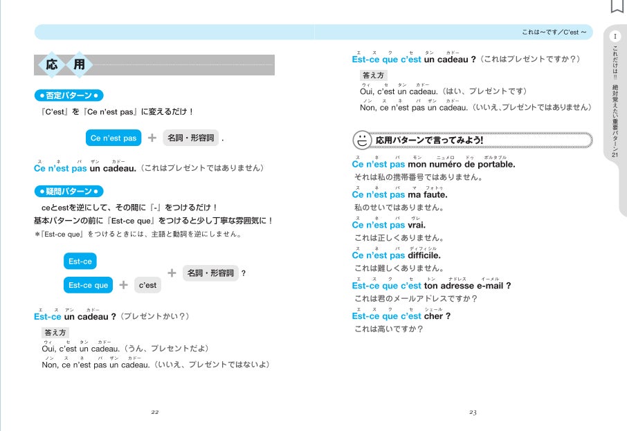 「Partie 1 これだけは!! 絶対覚えたい重要パターン21」では、基本的な会話のパターン21個を学びます。そして「応用」では、それぞれの否定パターンと疑問パターンも学ぶことができます。