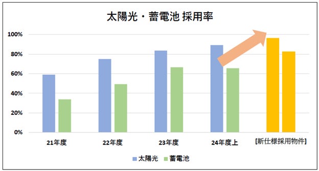 さらに、FIT制度による売電期間終了後の売電単価下落や買電単価の上昇を背景に、電気の自給自足への関心が高まる中、当社は太陽光発電と蓄電池のセット採用を積極的に推進。その結果2024年度実績で都内戸建住宅での太陽光発電搭載率93%を達成し、蓄電池搭載率は標準仕様化前の66%から82%と大幅に向上しました。