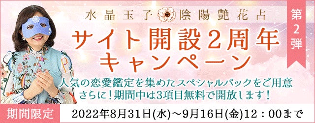 テレシスネットワーク株式会社(本社:東京都港区、代表取締役:鷹石惠充)は、2022年8月31日(水)より、月額公式サイト『水晶玉子 陰陽艶花占』にて『サイト開設2周年キャンペーン第2弾』を公開いたしました。