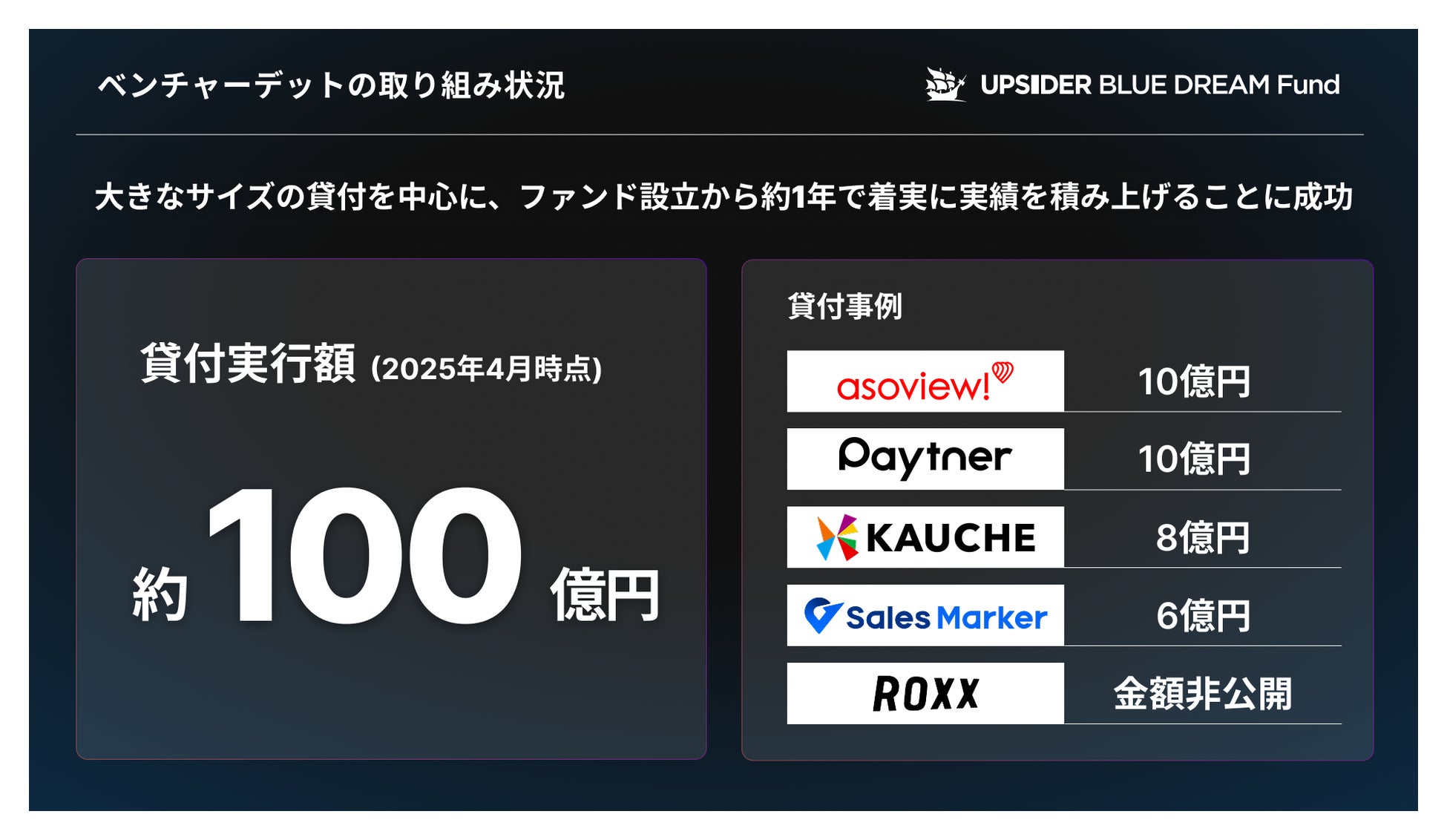 2023年12月にリリースしたスタートアップ向けデットファンド「UPSIDER BLUE DREAM Fund」は、「ともに、速く、遠くに」をキャッチコピーに、最大10億円の大きな融資を素早い審査で実行しております。ファンド立ち上げから1ヶ月で第一号案件となる株式会社ROXXへ融資を実行したことを皮切りに、立ち上げて1年間で約100億円の融資を実行しています(2024年12月末時点)。