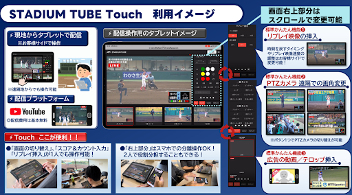 「STADIUM TUBE Touch」は、常設設置したAIカメラやPTZカメラなどの複数映像を、タブレット端末の映像画面をタッチするだけで一般の方でも簡単にプロ感覚で画面の切り替え操作をすることができます。また、デザイン化されたカウントや得点などのスコアの表示、テロップ表示、プレーのリプレイ挿入などもボタン1つで行えます。打者や投手のアップを撮影できるPTZカメラ(1塁、3塁の各ベンチに設置)の映像も、タブレット操作でスコアボードやベンチ内など様々な画面に切りえることが可能です。 撮影された試合映像は、 独自の配信プラットフォーム「STADIUM TUBE MYPAGE」や視聴可能で、YouTubeなどで配信することも可能です。