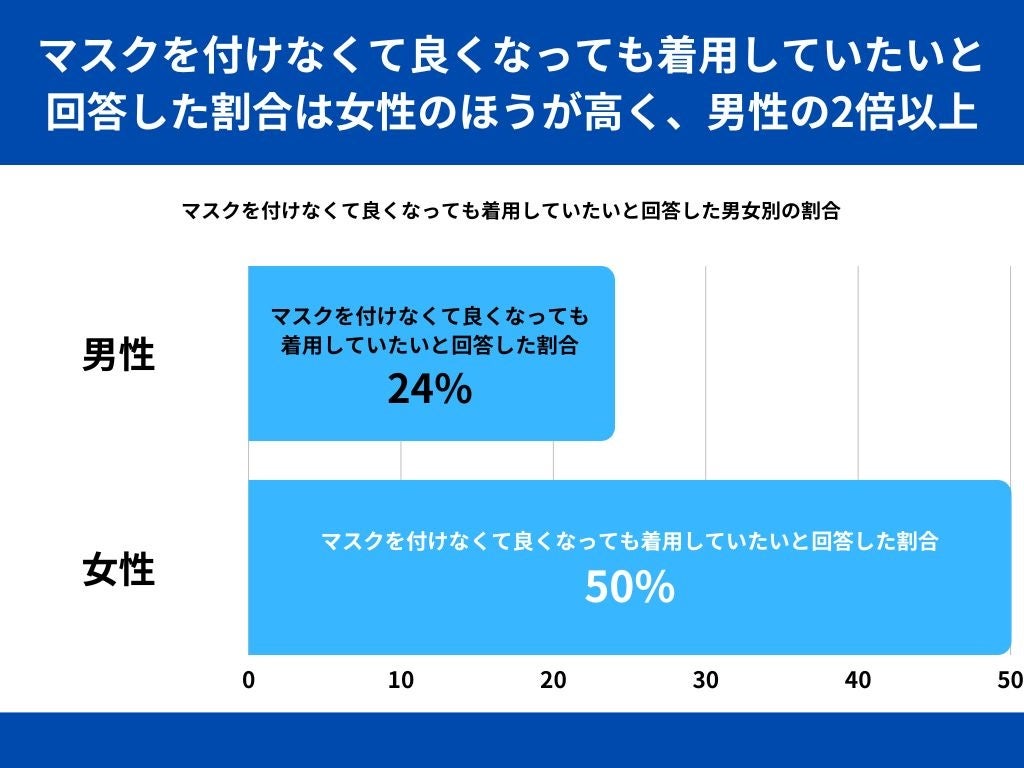 【マスクを付けなくて良くなっても着用していたいと回答した割合は女性のほうが高く、男性の2倍以上】