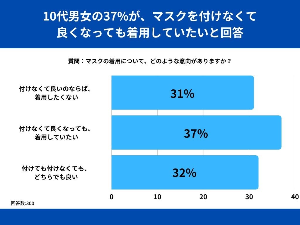 10代の男女を対象とした「マスクの着用について、どのような意向がありますか?」というアンケートで最も多かった回答は「付けなくて良くなっても、着用していたい」で37%でした。