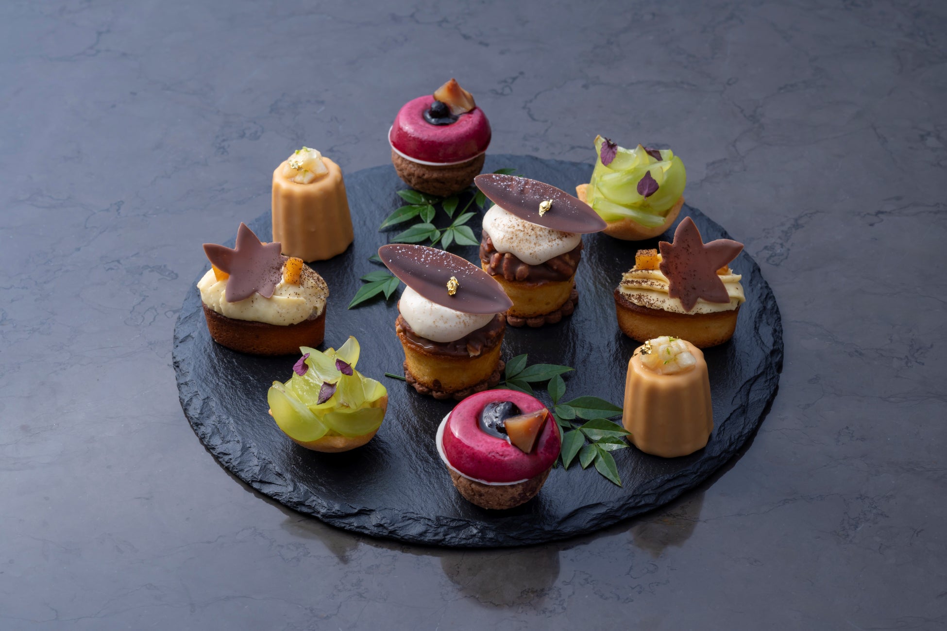 スイーツ5種では、バニラ風味のホワイトチョコレートガナッシュにフレッシュなマスカットをたっぷり乗せた「マスカットタルト」や、梨のコンフィとメープルクリームが秋らしさを演出する「メープルペアーケーキ」、チョコレートシューにカシスのコンポート、ババロアクリームにキャンディドマロンを包んだ「マロンカシス」など、旬のフルーツの美味しさを存分に味わえる内容に。