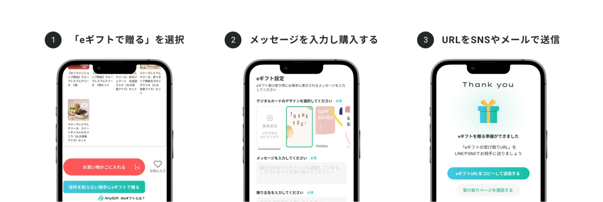 AnyGiftは、相手の住所を知らなくてもLINEやメールで贈ることができる「eギフト機能」を、ECサイトに組み込むことができるサービスです。