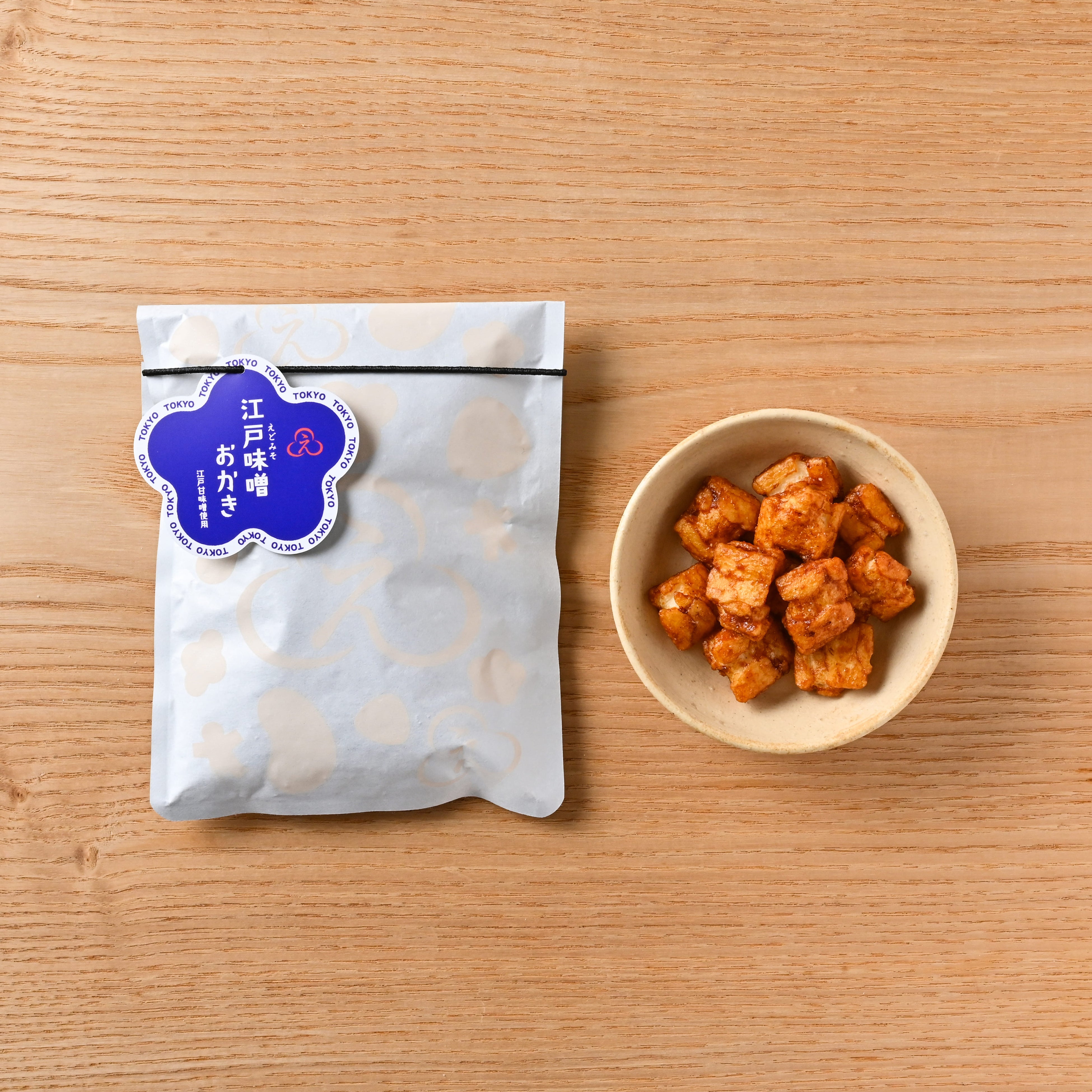 塩分が少なく、米麴由来の甘みが強い江戸甘味噌を使用したおかき。