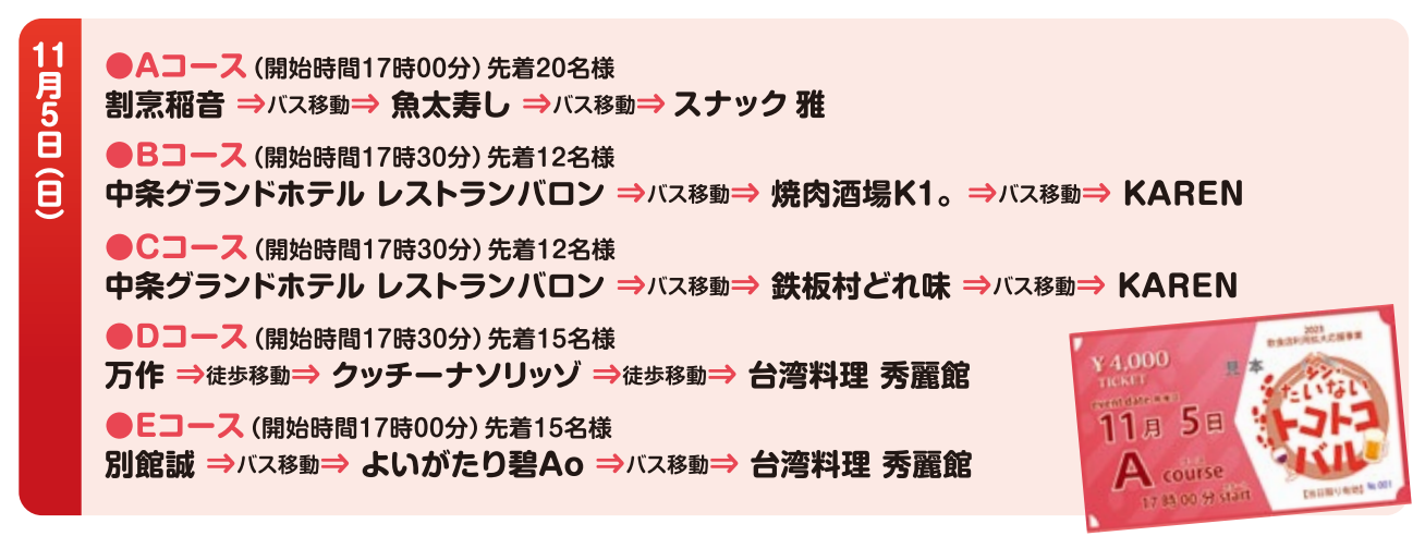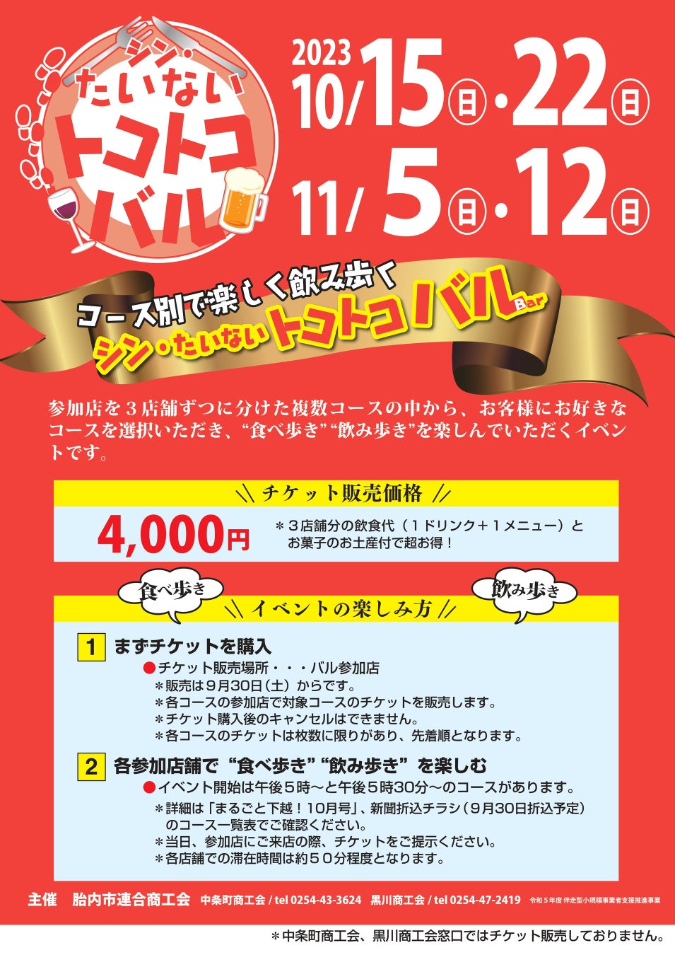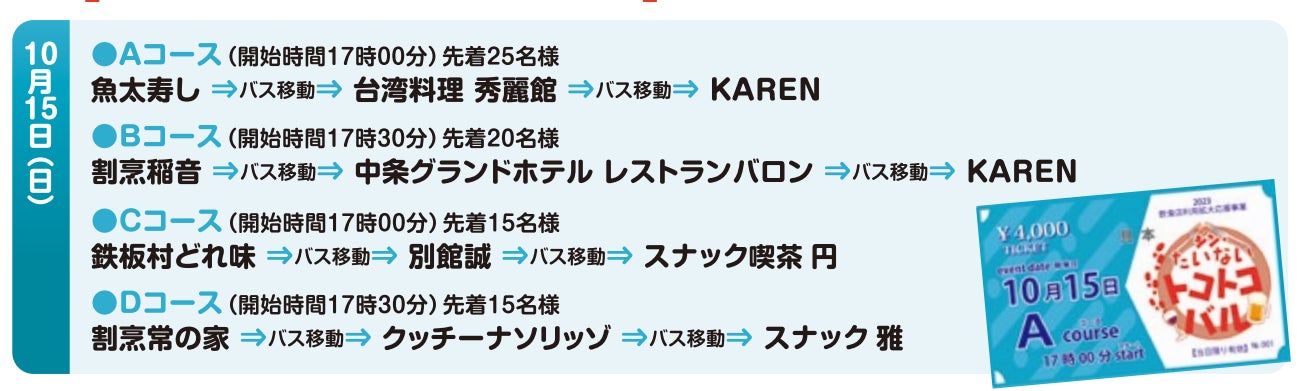 胎内市の参加店を3店舗ずつに分けた複数コースの中から、お客様にお好きなコースを選んで“食べ歩き”“飲み歩き”を楽しむ、新しいスタイルのイベントです。