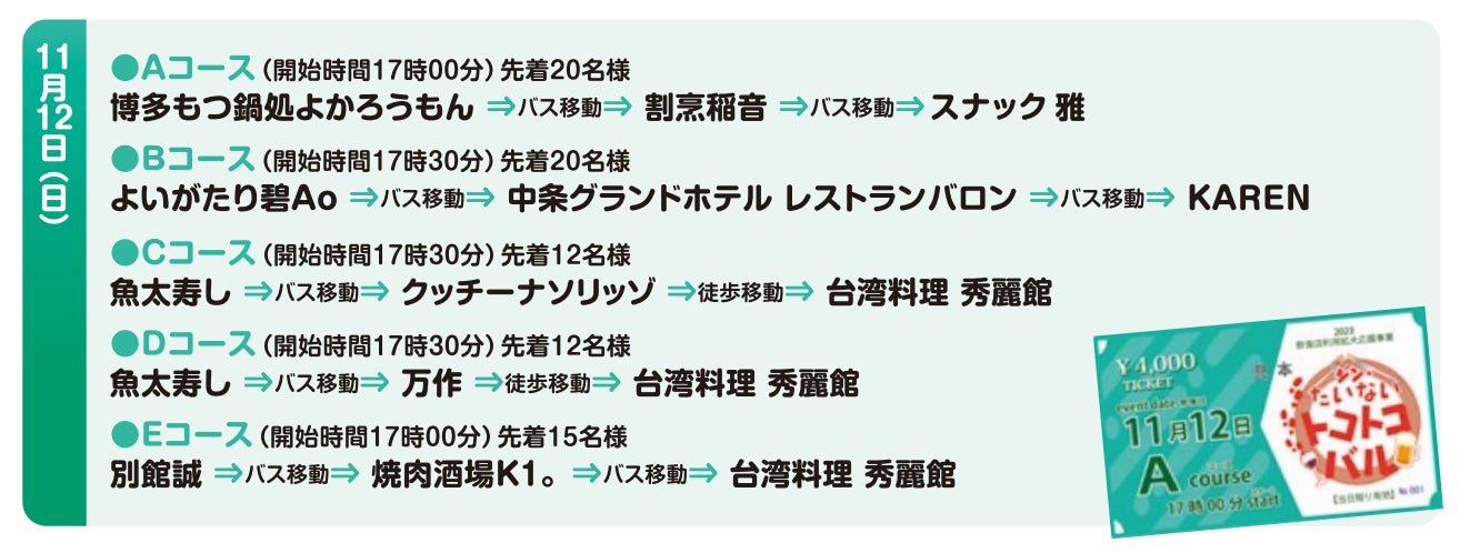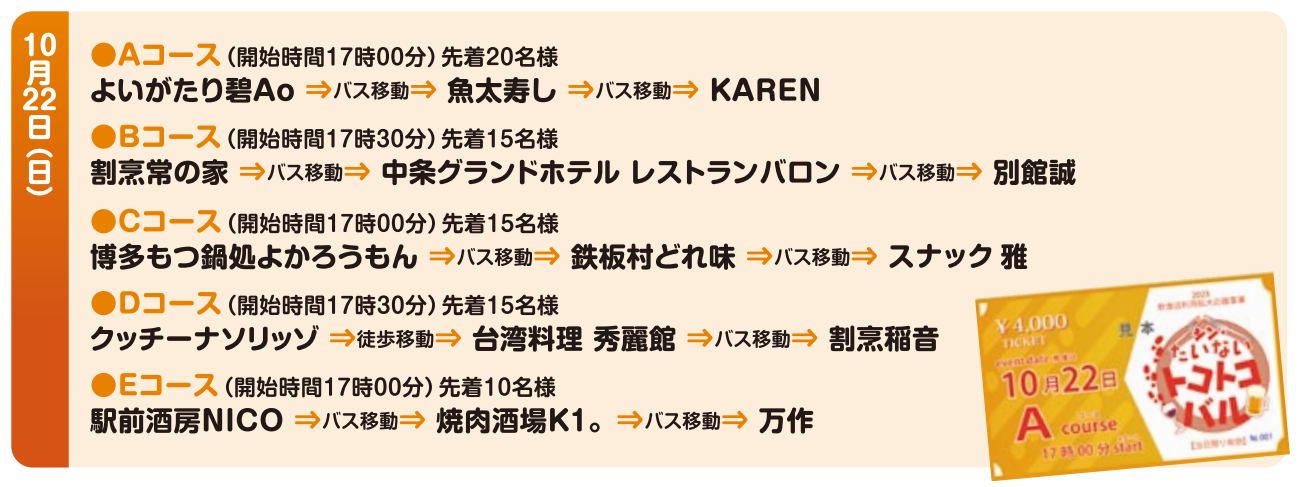コース別で楽しく飲み歩く「シン・たいないトコトコバル」、ぜひご参加ください。