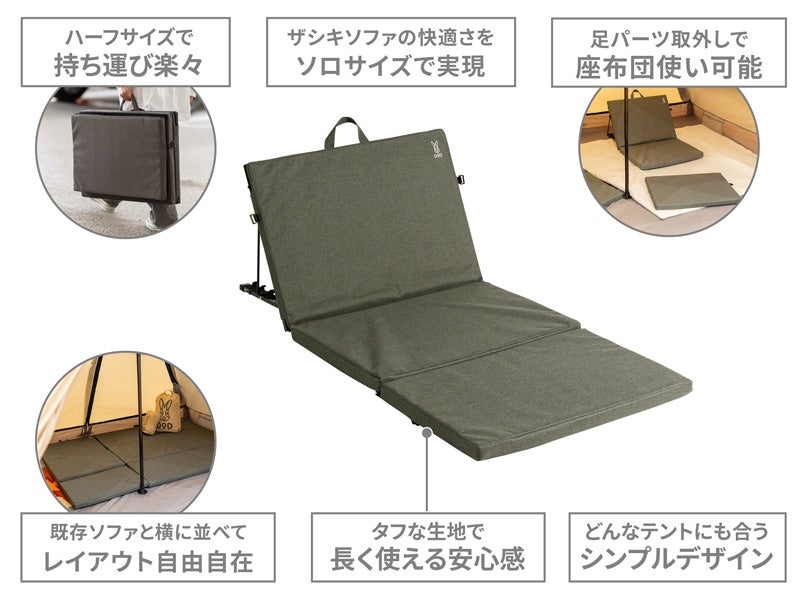 そんな悩みを解決するのが「ザシキソファハーフ」。本製品は、元々アウトドア環境下での高い快適 性と耐久性を追求して設計されており、潰れやすいクッション材に頼らず高耐久な「フレーム構造」を 骨格として採用しています。このフレーム構造により、従来の座椅子では実現し得なかった「ソファの ような安定した座り心地」と「長期間の使用に耐える高い耐久性」の両立を実現。こたつの新しい相棒 として、冬の長いおうち時間にくつろぎを提供します。