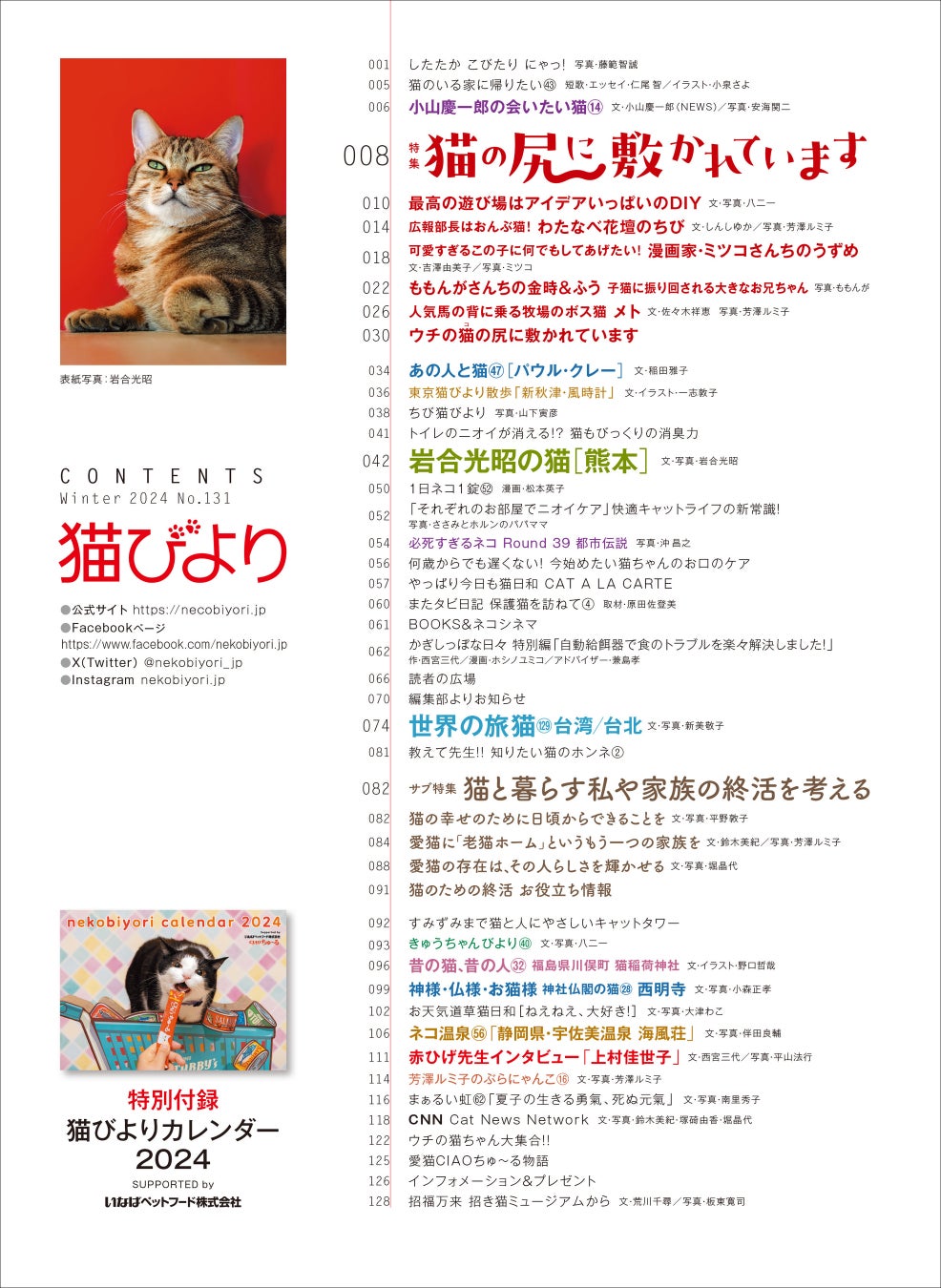 他にも、猫とのふたり暮らしで飼い主にもしものことがあったときや、離れて暮らす家族と猫に何かあったときのことを考える終活特集も充実。NEWS・小山慶一郎さんは猫好きの聖地とも言われる豪徳寺へ、岩合光昭さんは熊本の猫たちを、新美敬子さんは台湾の台北を訪ねます。猫好きなら最初から最後まで楽しみ尽くせる盛りだくさんの内容です。