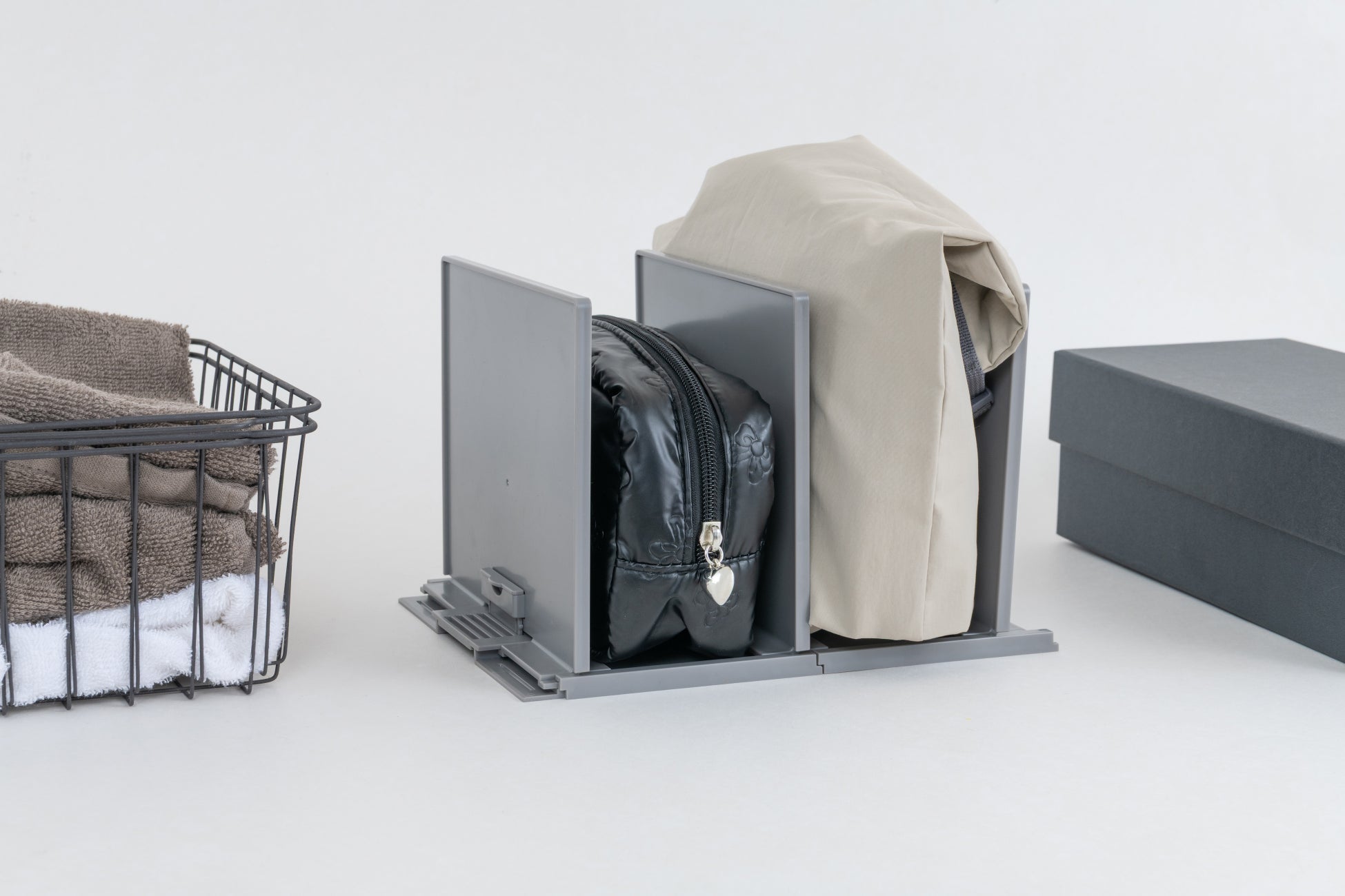 連結するとさらに自由に幅を調整できるようになり、ポーチやガジェットなどの厚みのある収納物の整理にもご使用いただけます。