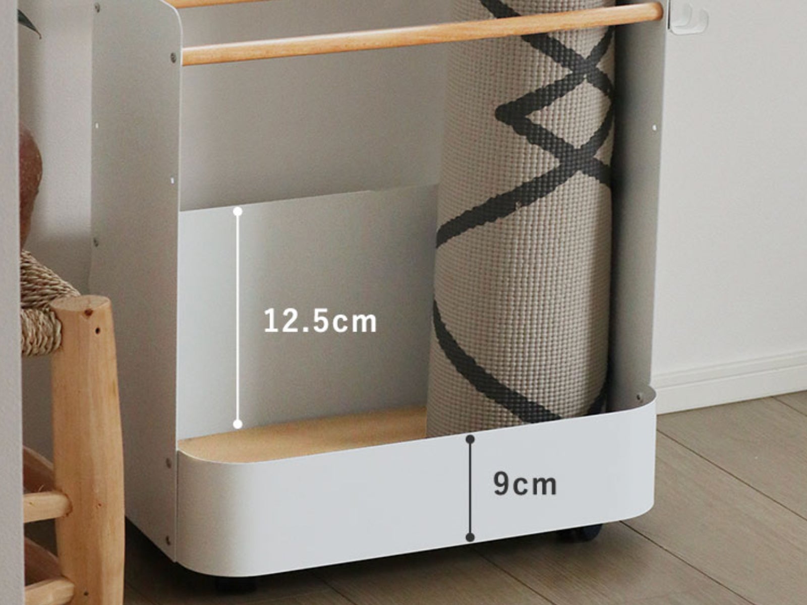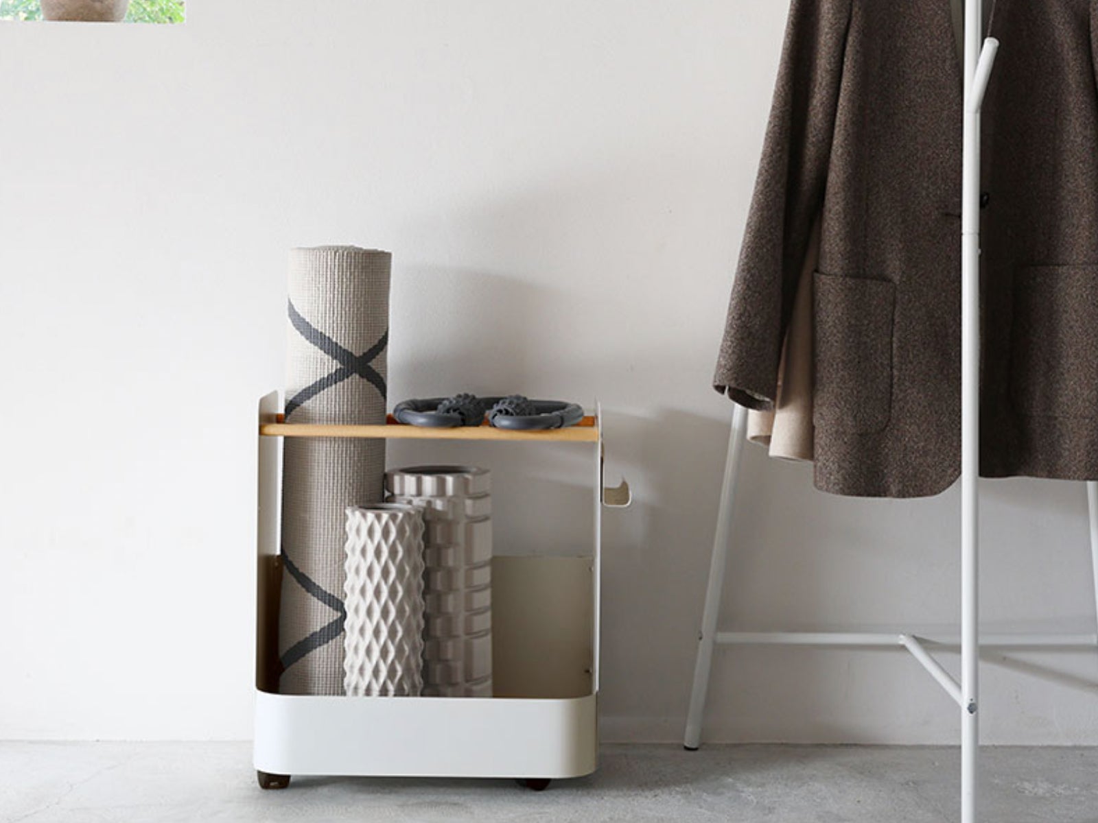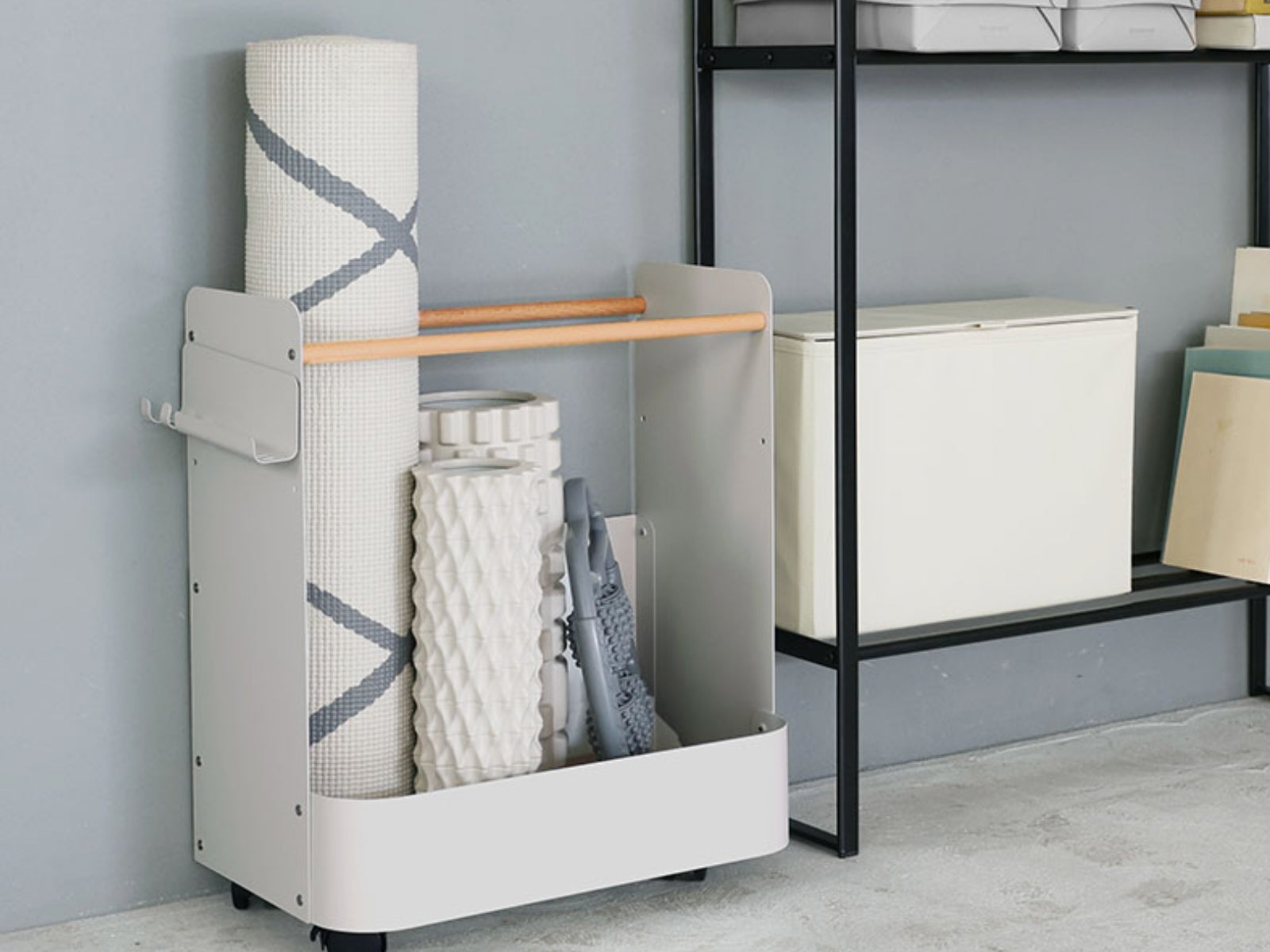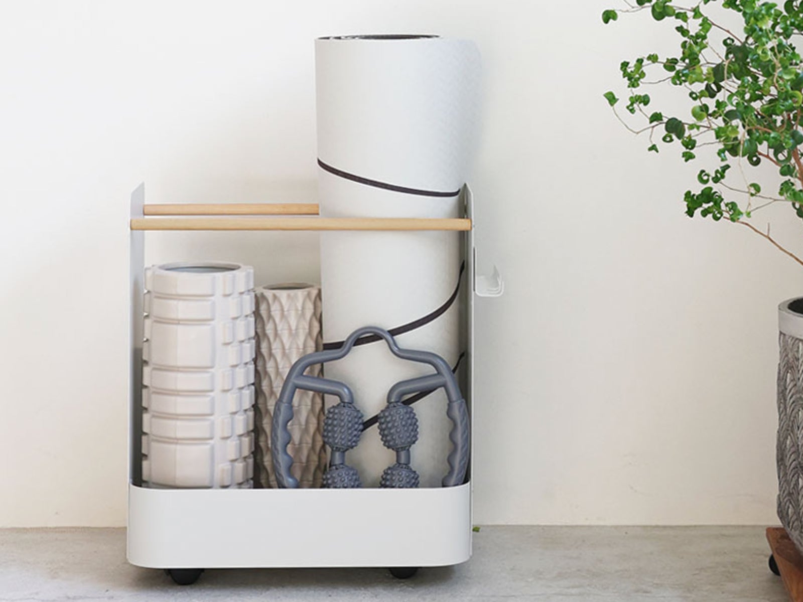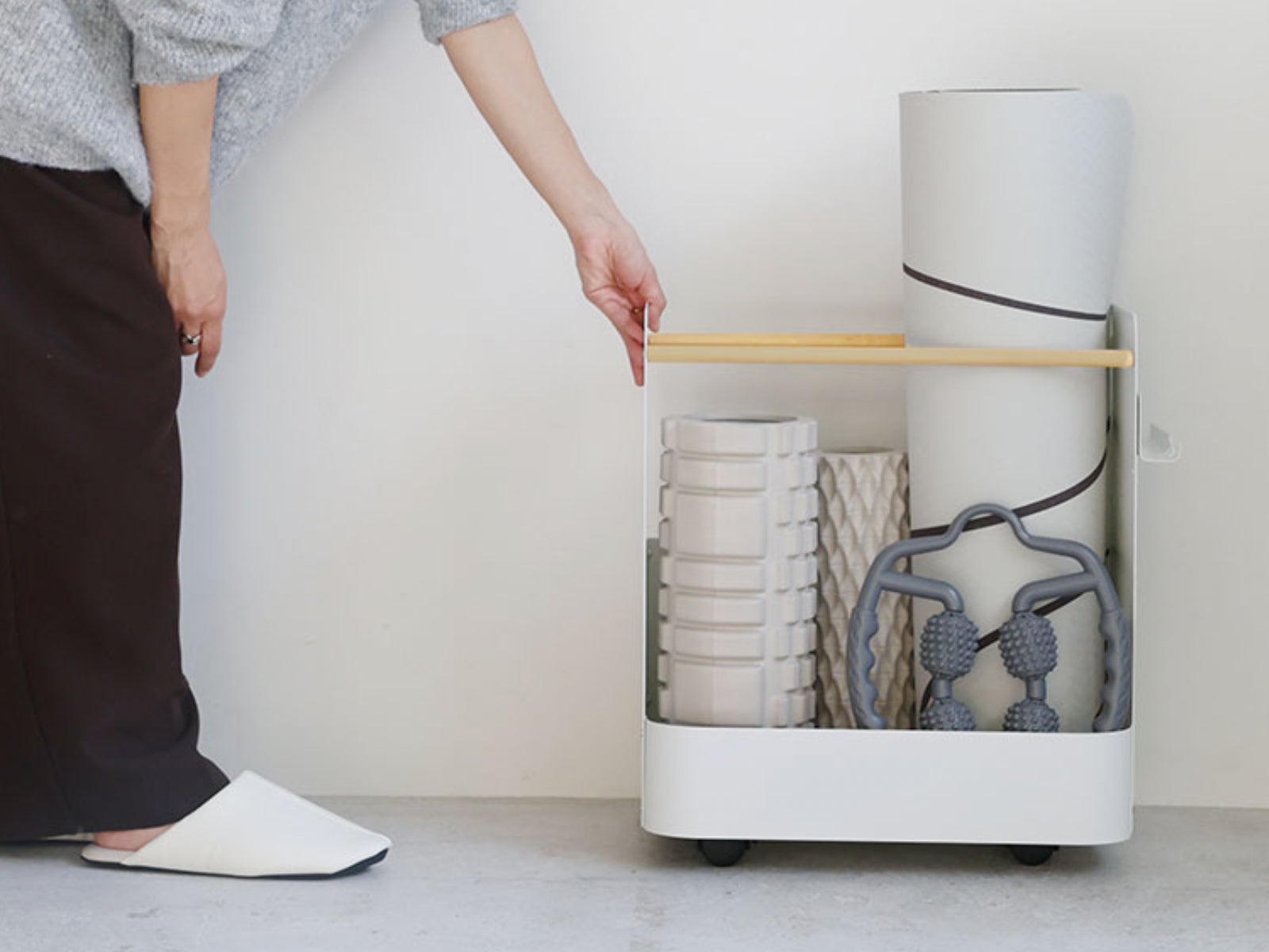ヨガマットやローラーなどのフィットネスアイテムを、すっきりとまとめられる収納ワゴン。