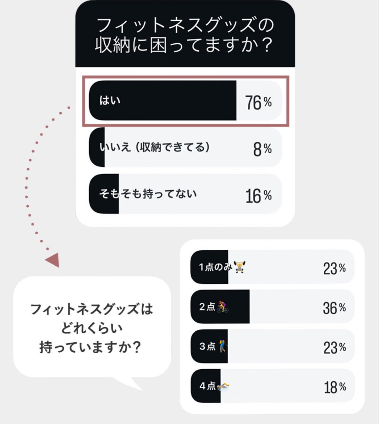 「フィットネスグッズの収納に困ってますか?」と疑問に対し、なんと回答者の約8割が「困っている」と答えました。