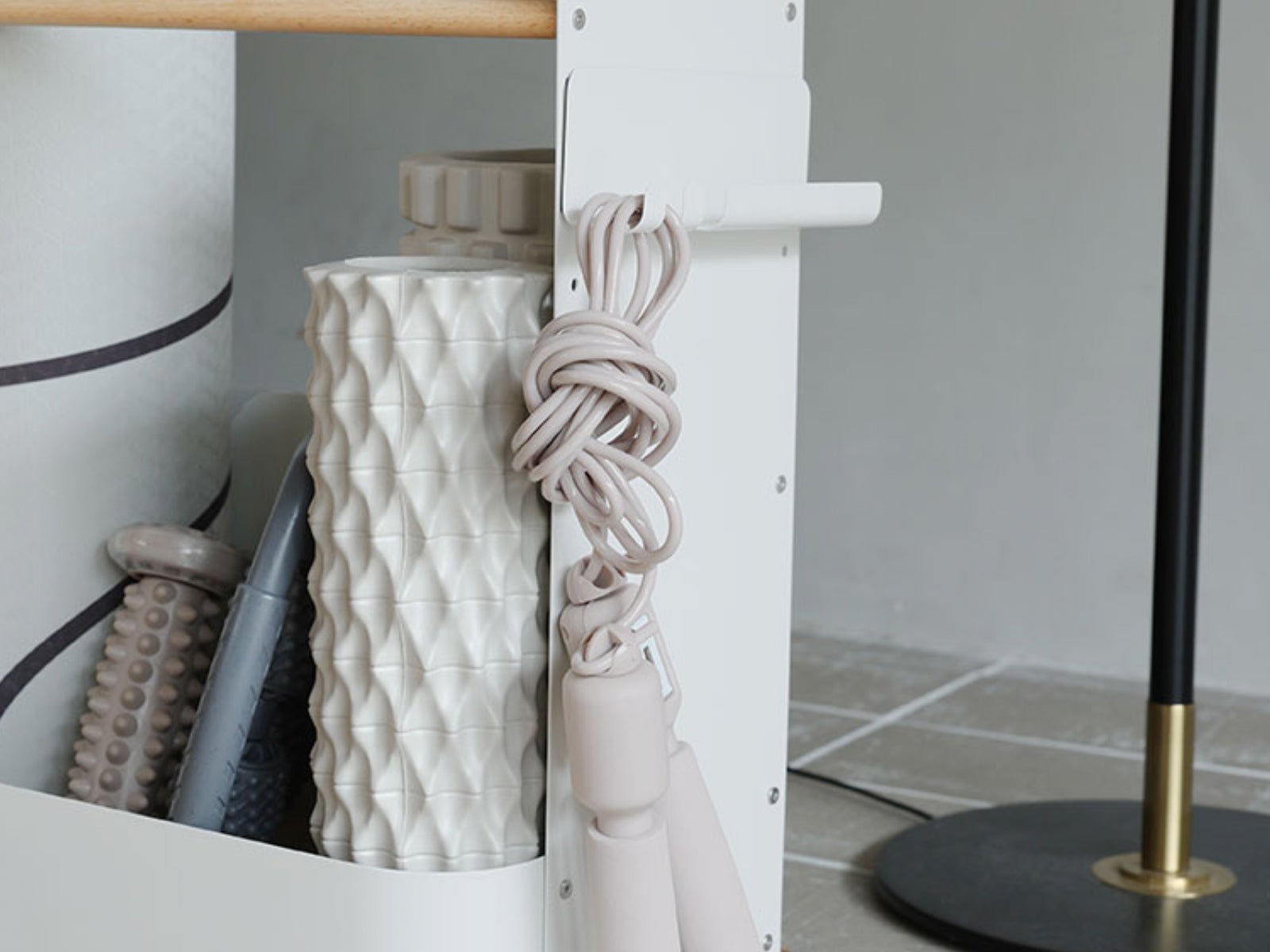さらにサイドのスチール板に取り付けられるマグネット式のフックパーツも付属。縄跳びなどの細かなグッズも引っ掛けて収納できます。