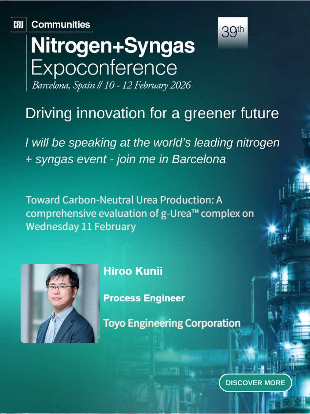 東洋エンジニアリング株式会社(代表取締役 取締役社長 CEO: 細井栄治、以下Toyo-Japan)は、2026年2月10日(火)~2月12日(木)にスペイン・バルセロナで開催される「CRU Nitrogen+Syngas Expoconference 2026」に出展します。