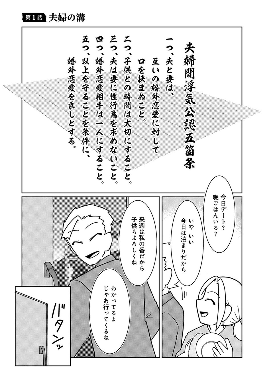 それは、夫婦間で決めた五箇条の約束の元、夫婦がお互いに彼氏・彼女を作ることを認めるというものであった――。