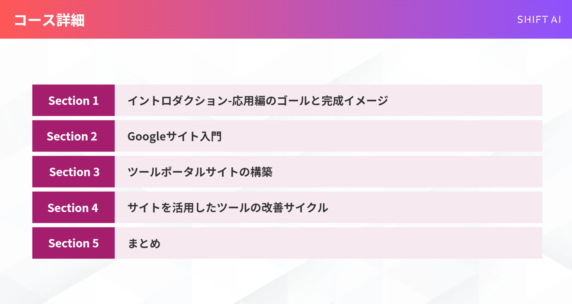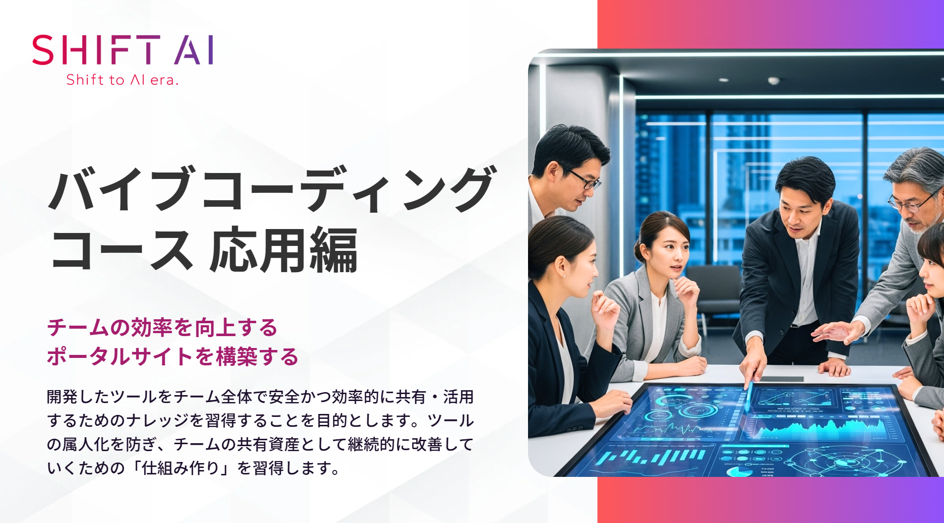 「日本をAI先進国に」を掲げ、AIのビジネス活用が学べる利用者数No.1※の生成AI学習コミュニティ「SHIFT AI」を運営する株式会社SHIFT AI(東京都渋谷区、代表取締役 木内翔大、以下当社)は、2025年12月24日より、法人向け生成AIリスキリングサービス「SHIFT AI for Biz」の新コースとして、「バイブコーディングコース応用編」の提供を開始します。本講座では、2025年11月に提供開始した「バイブコーディングコース実践編」で受講者が自作したツールをチームで共有し、継続的な改善および運営が可能なポータルサイトをGoogleサイトで構築することをゴールとしています。