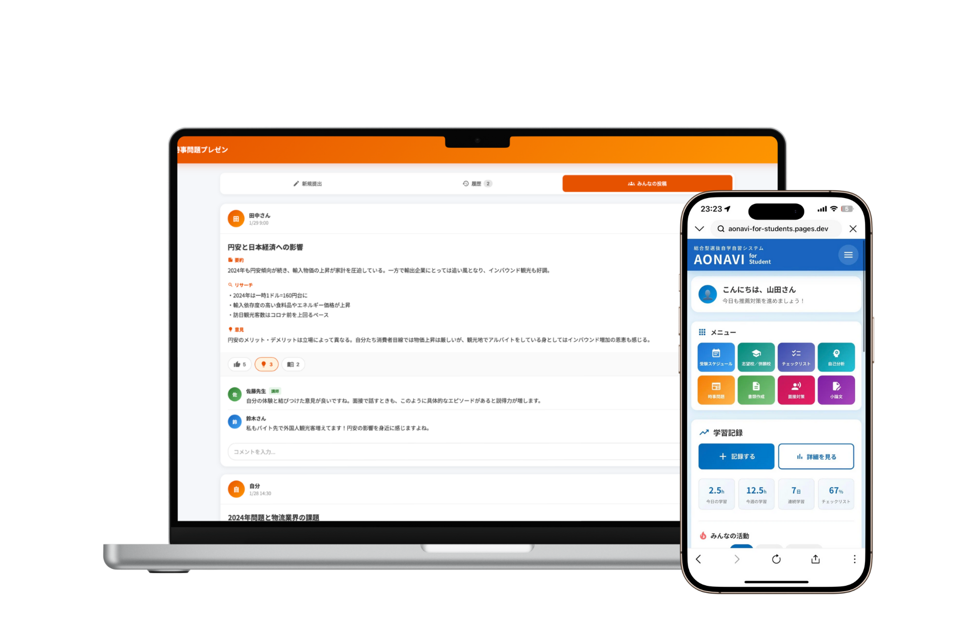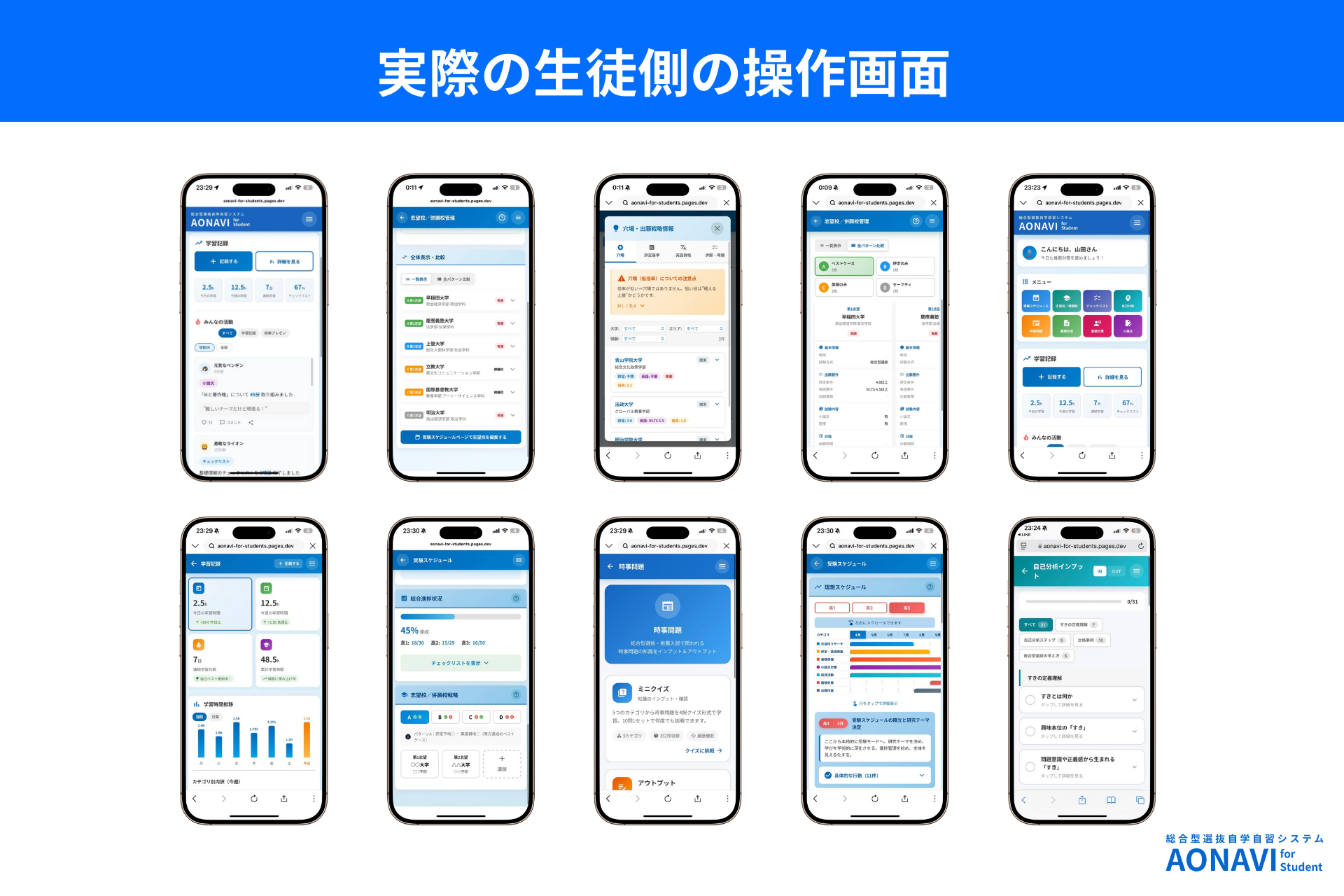 AONAVIは、地域や家庭環境に左右されず対策を可能にし、教育機会の平等性を高めます。また高校現場では、進捗管理の自動化、指導内容の標準化、教材共有の効率化を通じて、指導負担の軽減と持続可能性向上に貢献します。さらに、自学自習を可能にする仕組みによって「塾に通わなければ対策できない」という構造そのものを見直し、受験産業の健全化にも寄与できると考えています。