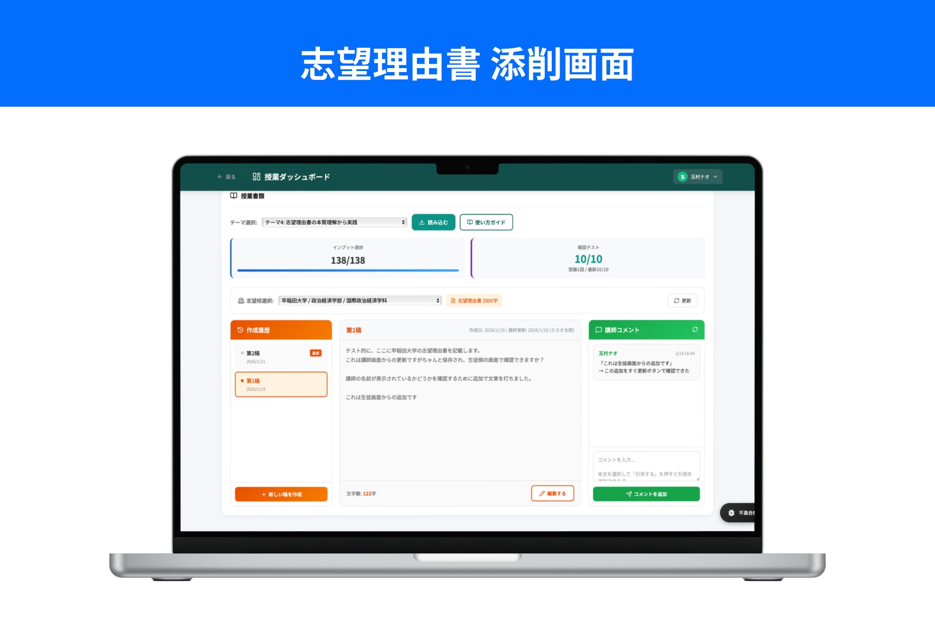 当社はこれまで、総合型選抜専門塾の運営を通じて、累計1,000名を超える指導実績を重ねてきました。その中で蓄積した再現性のある指導プロセスをベースに、複数名のエンジニアと共同で本システムを開発しています。