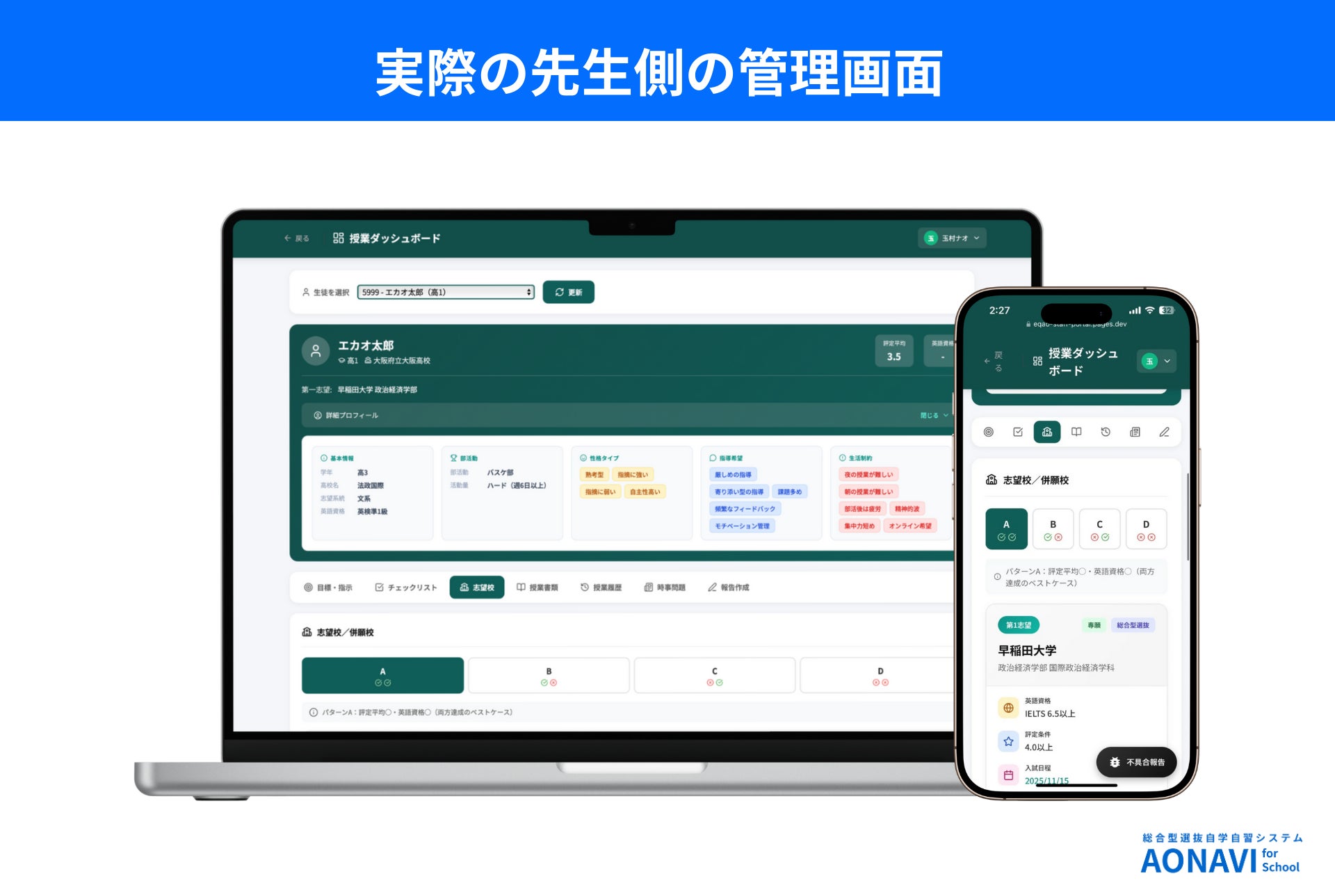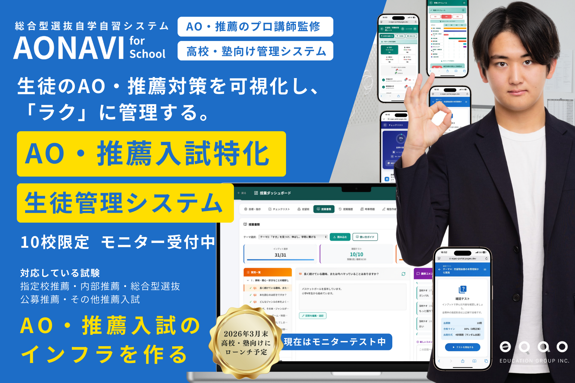 高校・学習塾向け「AONAVI for School」提供開始予定─総合型選抜・推薦入試の指導と進捗管理を、校内で標準化・可視化する業界初※の管理システム。2026年3月末リリース。推薦対策管理ツール