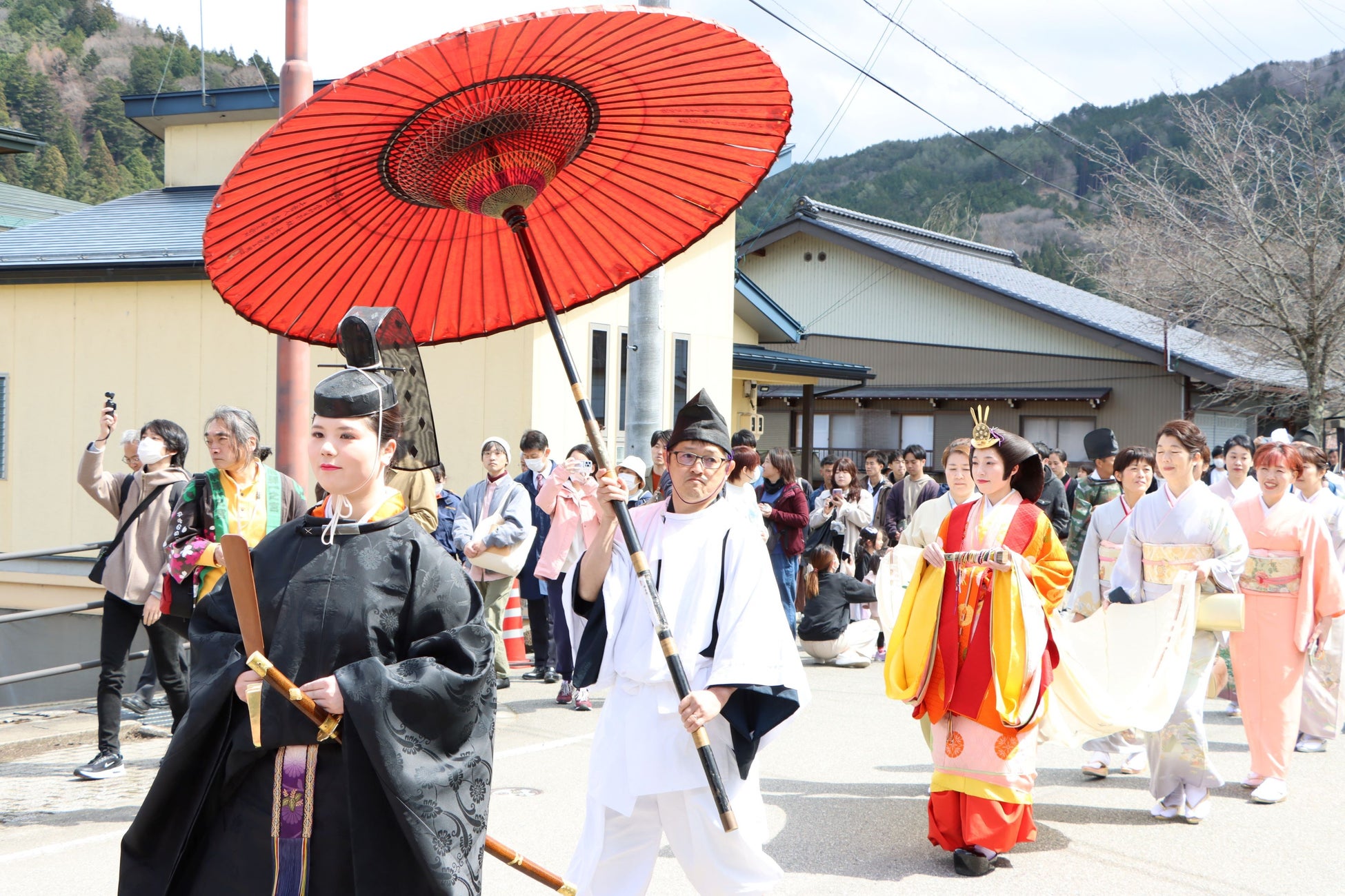 一之宮町では4月3日に、女性の幸福や農業の繁栄を願う「生きびな祭」が行われ、町内は平安絵巻さながらの華やかな雰囲気に包まれました。